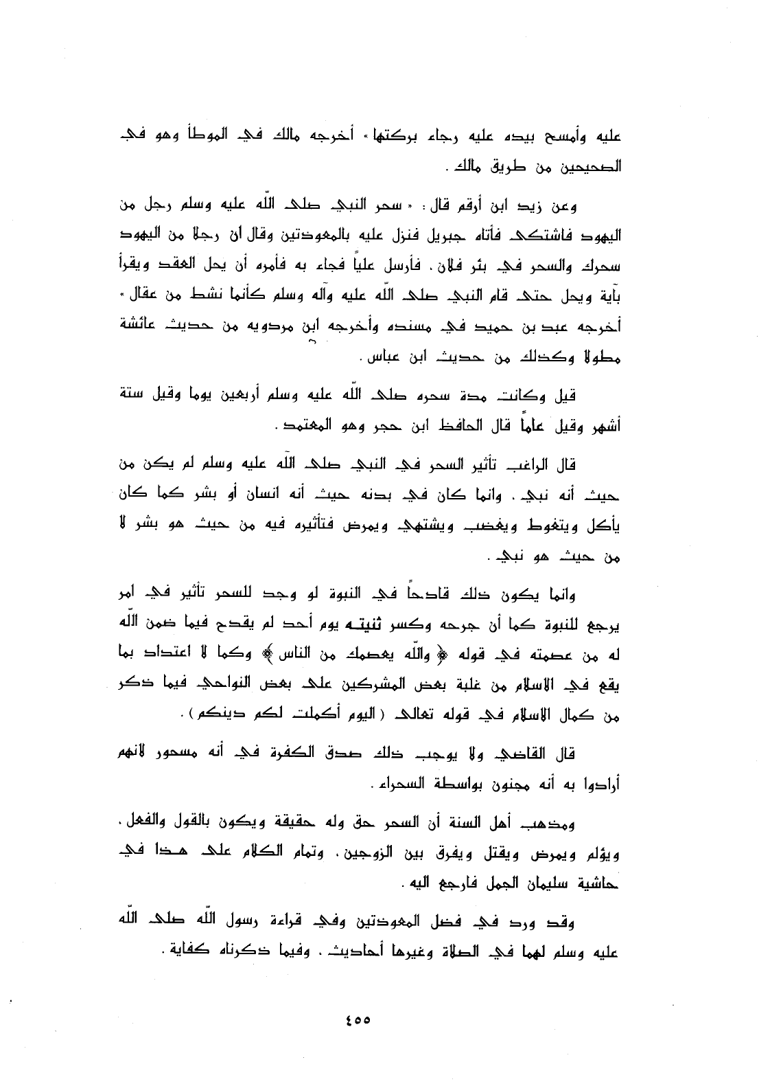 وعن زيد بن أرقم قال: " سحر النبي - صلى الله عليه وسلم - رجل من اليهود فاشتكى فأتاه جبريل فنزل عليه بالمعوذتين وقال إن رجلاً من اليهود سحرك والسحر في بئر فلان، فأرسل علياً فجاء به فأمره أن يحل العقد ويقرأ بآية ويحل حتى قام النبي - صلى الله عليه وآله وسلم - كأنما نشط من عقال " أخرجه عبد بن حميد في مسنده وأخرجه ابن مردويه من حديث عائشة مطولاً وكذلك من حديث ابن عباس.