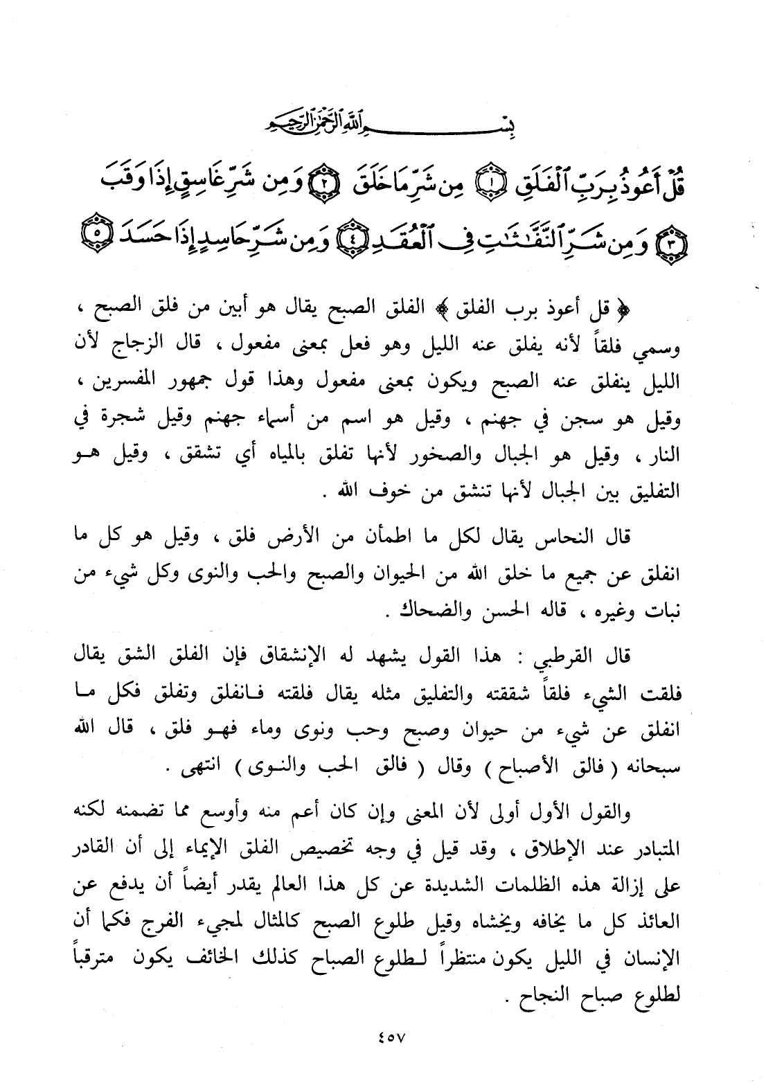 (قُلْ أَعُوذُ بِرَبِّ الْفَلَقِ) الفلق الصبح يقال هو أبين من فلق الصبح، وسمي فلقاً لأنه يفلق عنه الليل وهو فعل بمعنى مفعول، قال الزجاج لأن الليل ينفلق عنه الصبح ويكون بمعنى مفعول وهذا قول جمهور المفسرين، وقيل هو سجن في جهنم، وقيل هو اسم من أسماء جهنم وقيل شجرة في النار، وقيل هو الجبال والصخور لأنها تفلق بالمياه أي تشقق، وقيل هو التفليق بين الجبال لأنها تنشق من خوف الله.
