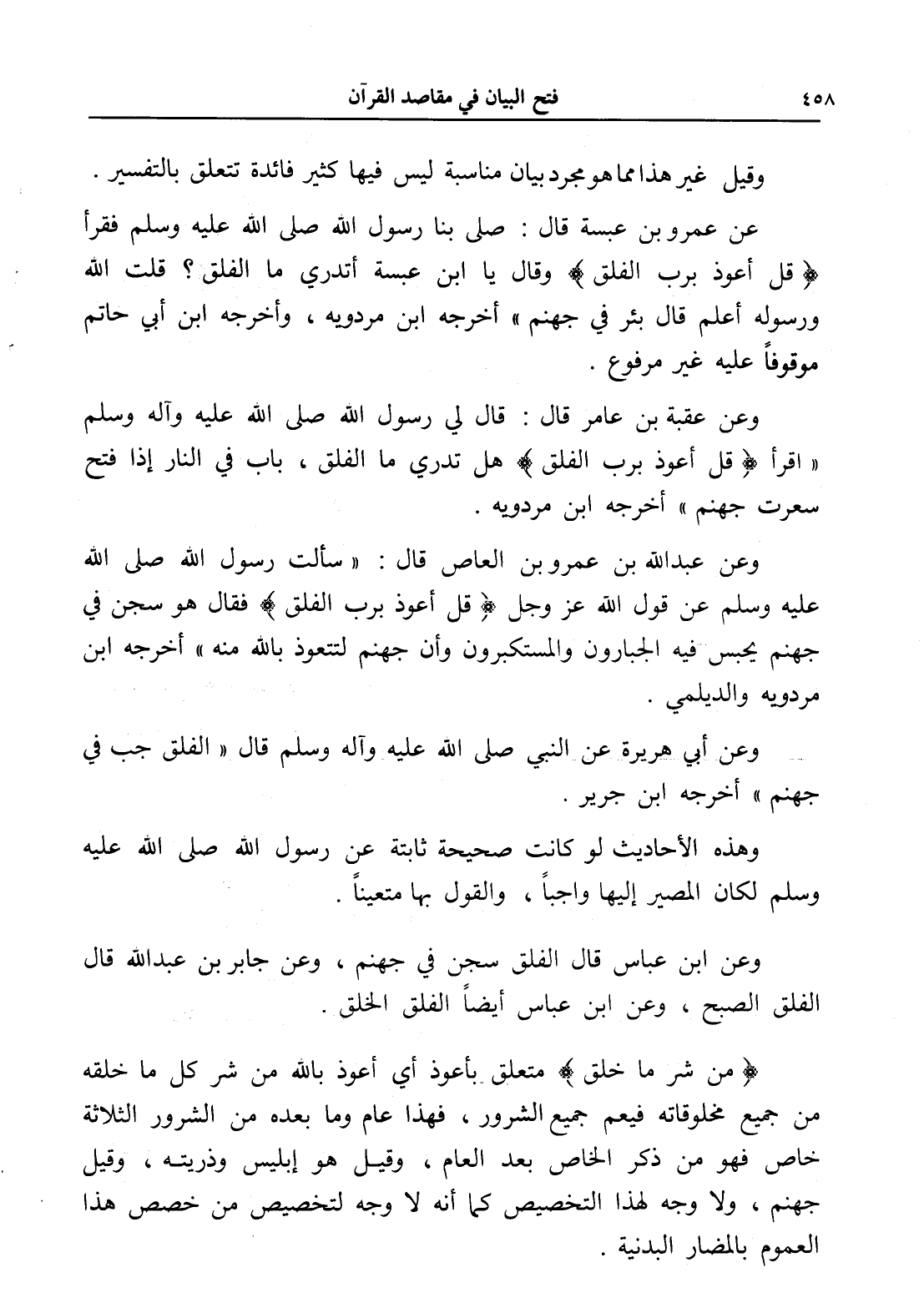 وعن عبد الله بن عمرو بن العاص قال: " سألت رسول الله صلى الله عليه وسلم عن قول الله عز وجل (قل أعوذ برب الفلق) فقال هو سجن في جهنم يحبس فيه الجبارون والمستكبرون وأن جهنم لتتعوذ بالله منه " أخرجه ابن مردويه والديلمي.