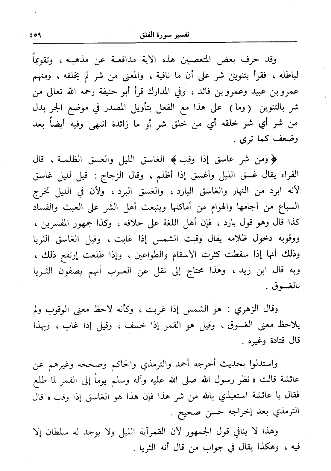 (ومن شر غاسق إذا وقب) الغاسق الليل والغسق الظلمة، قال الفراء يقال غسق الليل وأغسق إذا أظلم، وقال الزجاج: قيل لليل غاسق لأنه أبرد من النهار والغاسق البارد، والغسق البرد، ولأن في الليل تخرج السباع من آجامها والهوام من أماكنها وينبعث أهل الشر على العبث والفساد كذا قال وهو قول بارد، فإن أهل اللغة على خلافه، وكذا جمهور المفسرين، ووقوبه دخول ظلامه يقال وقبت الشمس إذا غابت، وقيل الغاسق الثريا وذلك أنها إذا سقطت كثرت الأسقام والطواعين، وإذا طلعت إرتفع ذلك، وبه قال ابن زيد، وهذا محتاج إلى نقل عن العرب أنهم يصفون الثريا بالغسوق.
