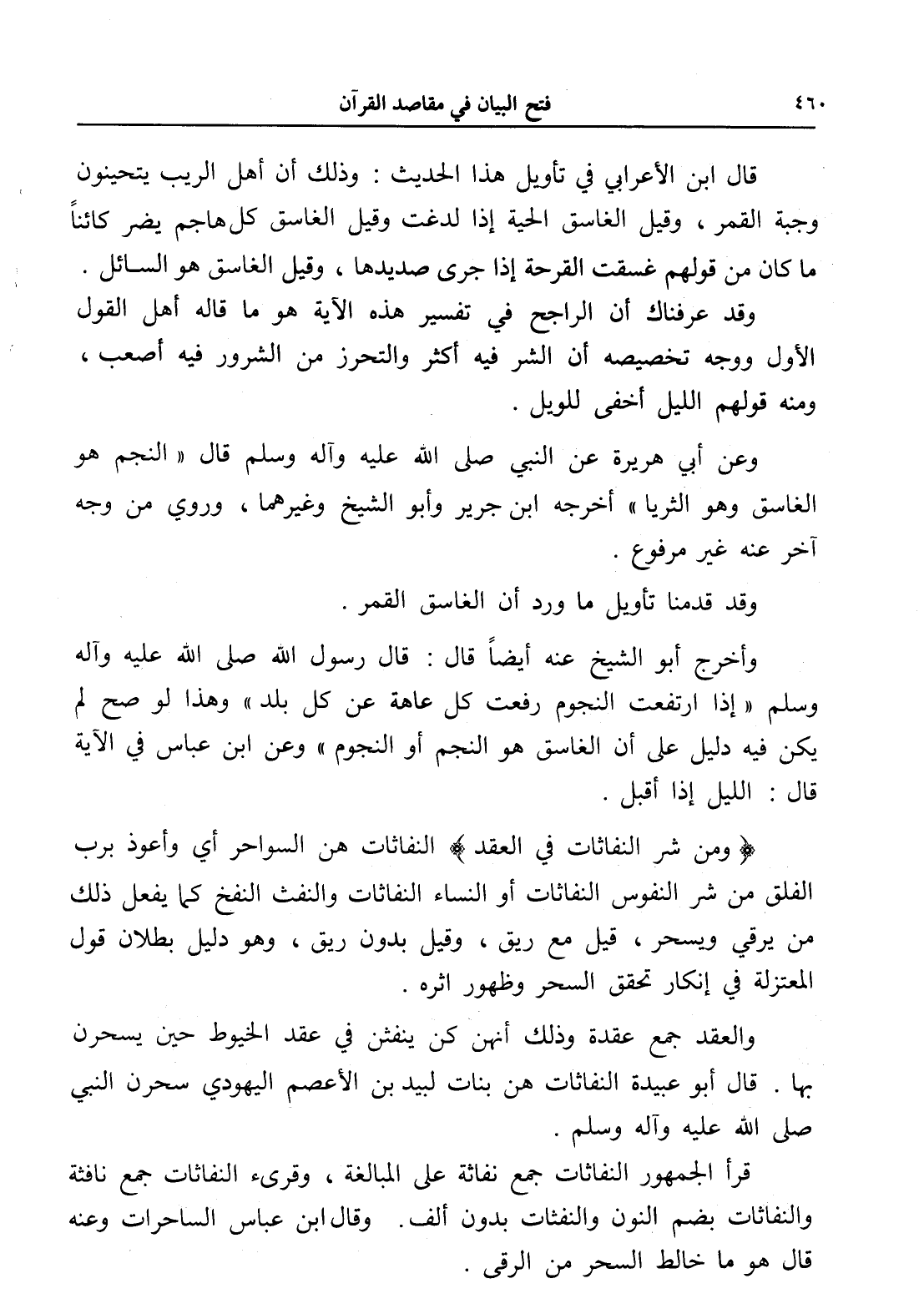 وأخرج أبو الشيخ عنه أيضاًً قال: قال رسول الله صلى الله عليه وآله وسلم " إذا ارتفعت النجوم رفعت كل عاهة عن كل بلد " وهذا لو صح لم يكن فيه دليل على أن الغاسق هو النجم أو النجوم " وعن ابن عباس في الآية قال: الليل إذا أقبل.