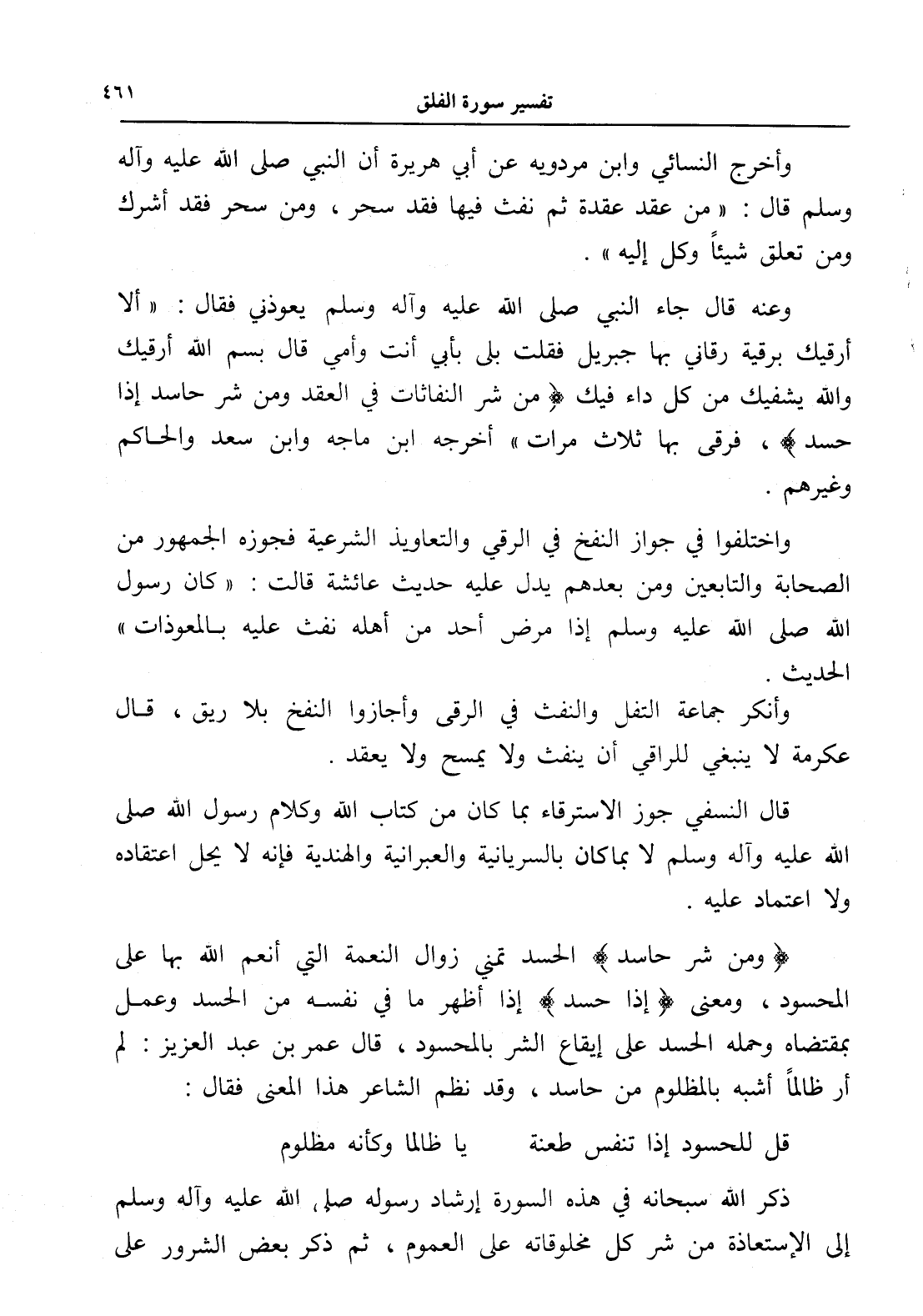 وأخرج النسائي وابن مردويه عن أبي هريرة أن النبي صلى الله عليه وآله وسلم قال: " من عقد عقدة ثم نفث فيها فقد سحر، ومن سحر فقد أشرك ومن تعلق شيئاًً وكل إليه ".