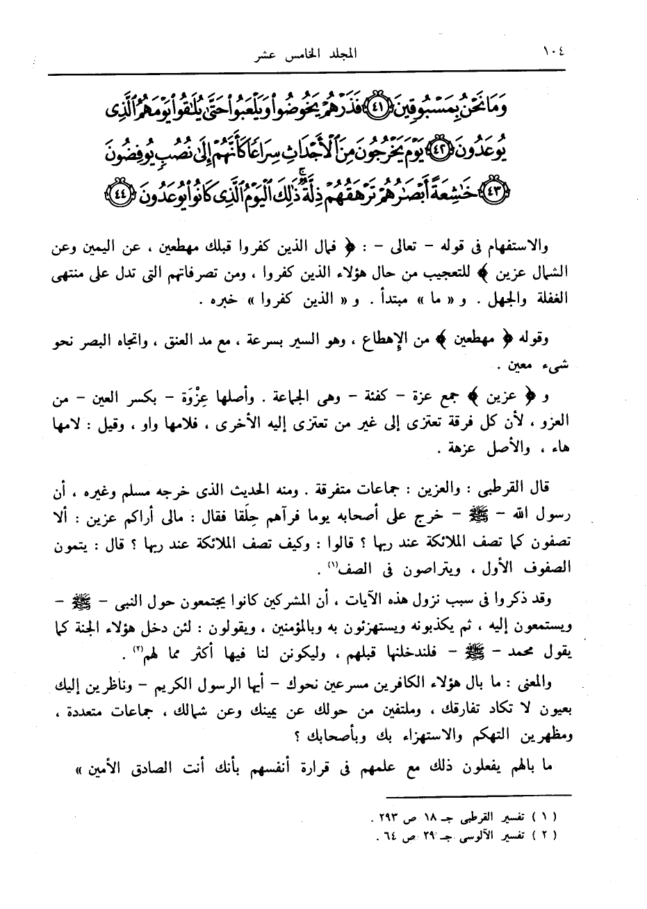 قال القرطبي: والعزين: جماعات متفرقة. ومنه الحديث الذي خرجه مسلم وغيره، أن رسول الله صلى الله عليه وسلم خرج على أصحابه يوما فرآهم حلقا فقال: مالي أراكم عزين: ألا تصفون كما تصف الملائكة عند ربها؟ قالوا: وكيف تصف الملائكة عند ربها؟ قال: يتمون الصفوف الأول، ويتراصون في الصف «1» .