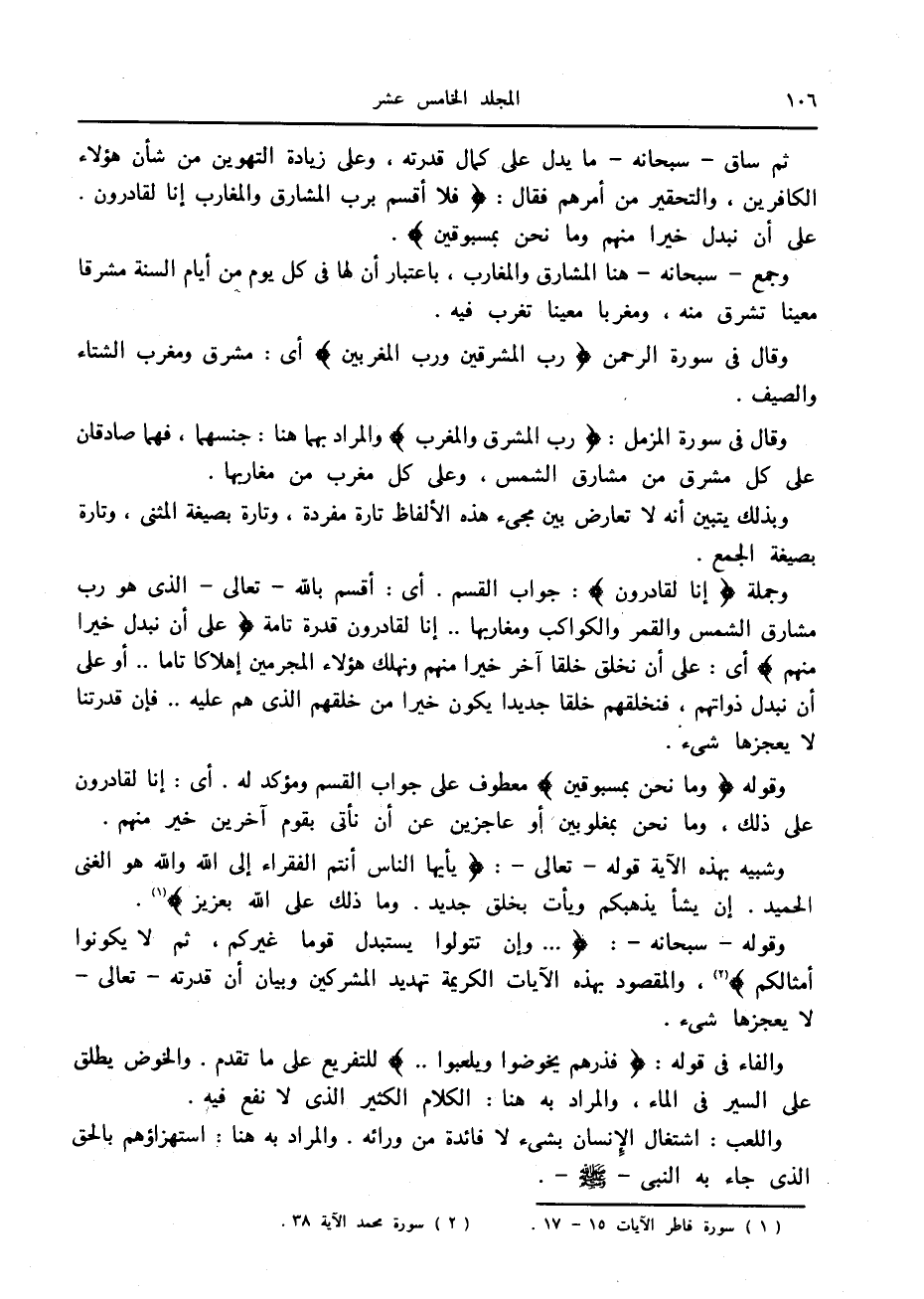 وجمع- سبحانه- هنا المشارق والمغارب، باعتبار أن لها في كل يوم من أيام السنة مشرقا معينا تشرق منه، ومغربا معينا تغرب فيه.