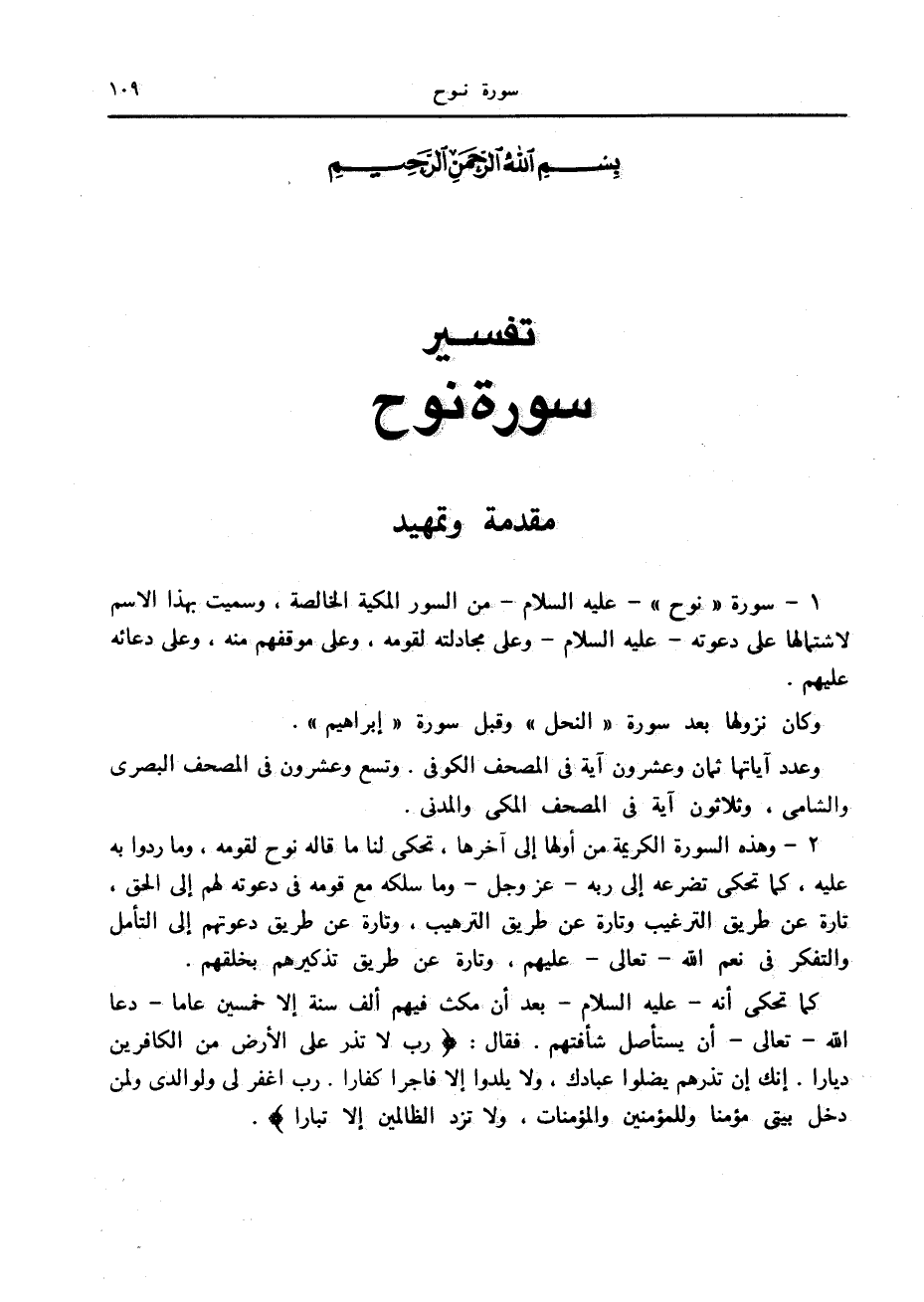 1- سورة «نوح» - عليه السلام- من السور المكية الخالصة، وسميت بهذا الاسم لاشتمالها على دعوته- عليه السلام- وعلى مجادلته لقومه، وعلى موقفهم منه، وعلى دعائه عليهم.
