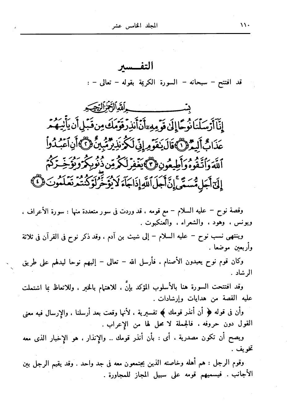 إِنَّا أَرْسَلْنا نُوحاً إِلى قَوْمِهِ أَنْ أَنْذِرْ قَوْمَكَ مِنْ قَبْلِ أَنْ يَأْتِيَهُمْ عَذابٌ أَلِيمٌ (1) قالَ يا قَوْمِ إِنِّي لَكُمْ نَذِيرٌ مُبِينٌ (2) أَنِ اعْبُدُوا اللَّهَ وَاتَّقُوهُ وَأَطِيعُونِ (3) يَغْفِرْ لَكُمْ مِنْ ذُنُوبِكُمْ وَيُؤَخِّرْكُمْ إِلى أَجَلٍ مُسَمًّى إِنَّ أَجَلَ اللَّهِ إِذا جاءَ لا يُؤَخَّرُ لَوْ كُنْتُمْ تَعْلَمُونَ (4)