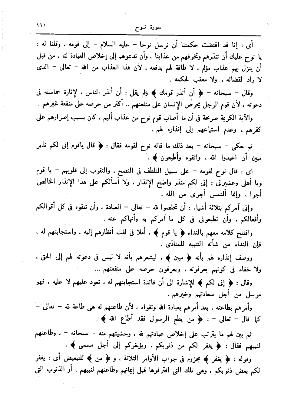 اى: قال نوح لقومه- على سبيل التلطف في النصح، والتقرب إلى قلوبهم- يا قوم ويا أهلى وعشيرتي: إنى لكم منذر واضح الإنذار، ولا أسألكم على هذا الإنذار الخالص أجرا، وإنما ألتمس أجرى من الله.