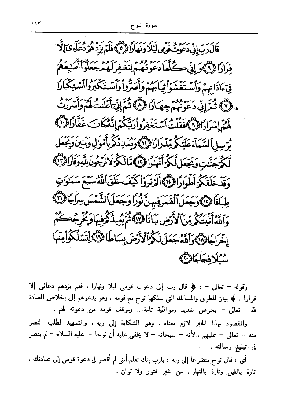 قالَ رَبِّ إِنِّي دَعَوْتُ قَوْمِي لَيْلاً وَنَهاراً (5) فَلَمْ يَزِدْهُمْ دُعائِي إِلاَّ فِراراً (6) وَإِنِّي كُلَّما دَعَوْتُهُمْ لِتَغْفِرَ لَهُمْ جَعَلُوا أَصابِعَهُمْ فِي آذانِهِمْ وَاسْتَغْشَوْا ثِيابَهُمْ وَأَصَرُّوا وَاسْتَكْبَرُوا اسْتِكْباراً (7) ثُمَّ إِنِّي دَعَوْتُهُمْ جِهاراً (8) ثُمَّ إِنِّي أَعْلَنْتُ لَهُمْ وَأَسْرَرْتُ لَهُمْ إِسْراراً (9)