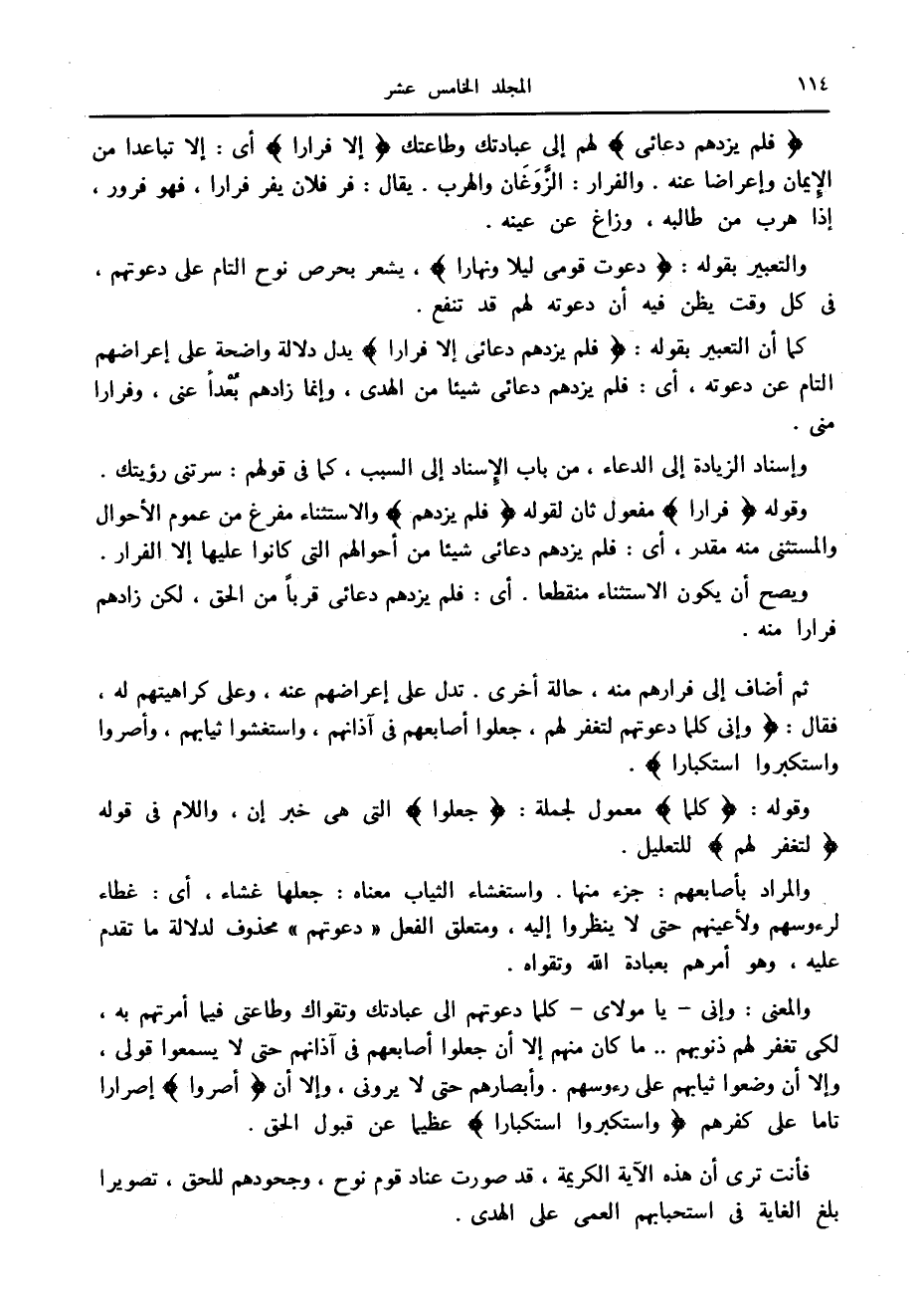 وقوله فِراراً مفعول ثان لقوله فَلَمْ يَزِدْهُمْ والاستثناء مفرغ من عموم الأحوال والمستثنى منه مقدر، أى: فلم يزدهم دعائي شيئا من أحوالهم التي كانوا عليها إلا الفرار.