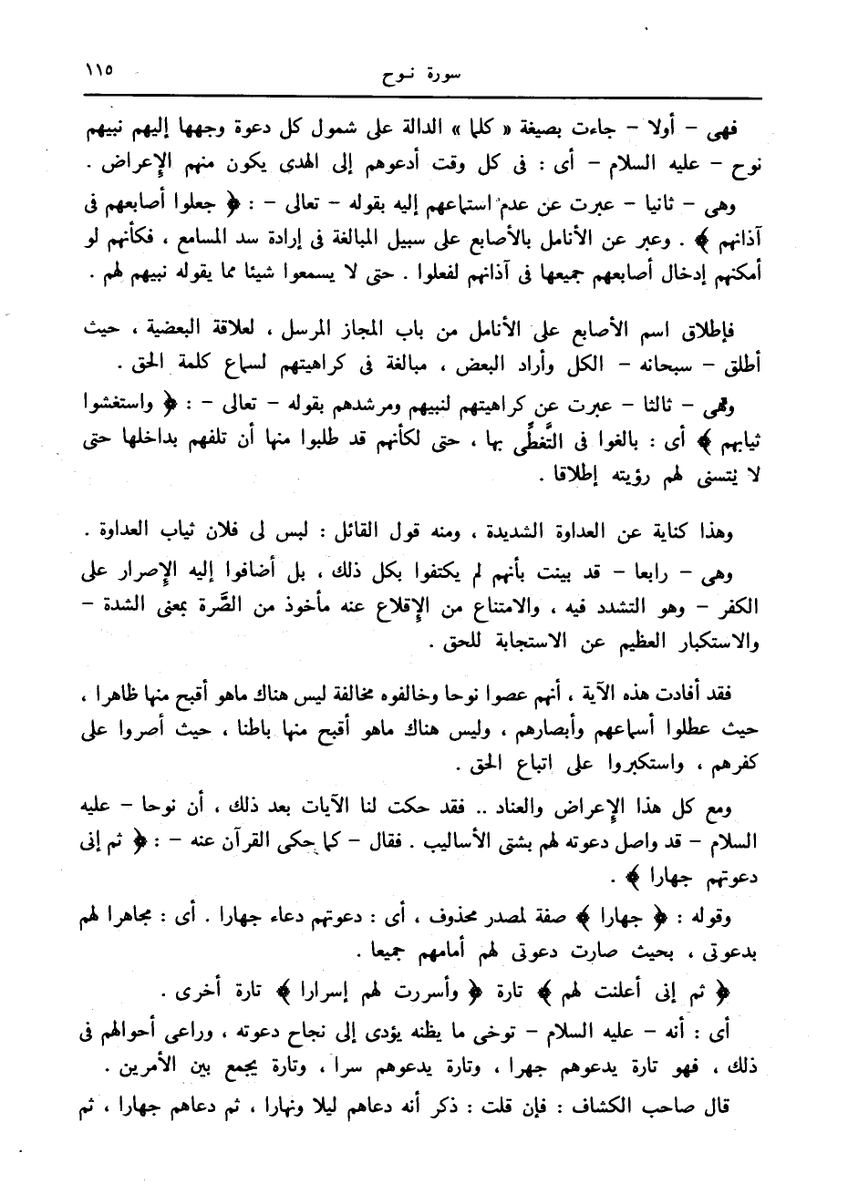 وهي- ثانيا- عبرت عن عدم استماعهم إليه بقوله- تعالى-: جَعَلُوا أَصابِعَهُمْ فِي آذانِهِمْ. وعبر عن الأنامل بالأصابع على سبيل المبالغة في إرادة سد المسامع، فكأنهم لو أمكنهم إدخال أصابعهم جميعها في آذانهم لفعلوا. حتى لا يسمعوا شيئا مما يقوله نبيهم لهم.