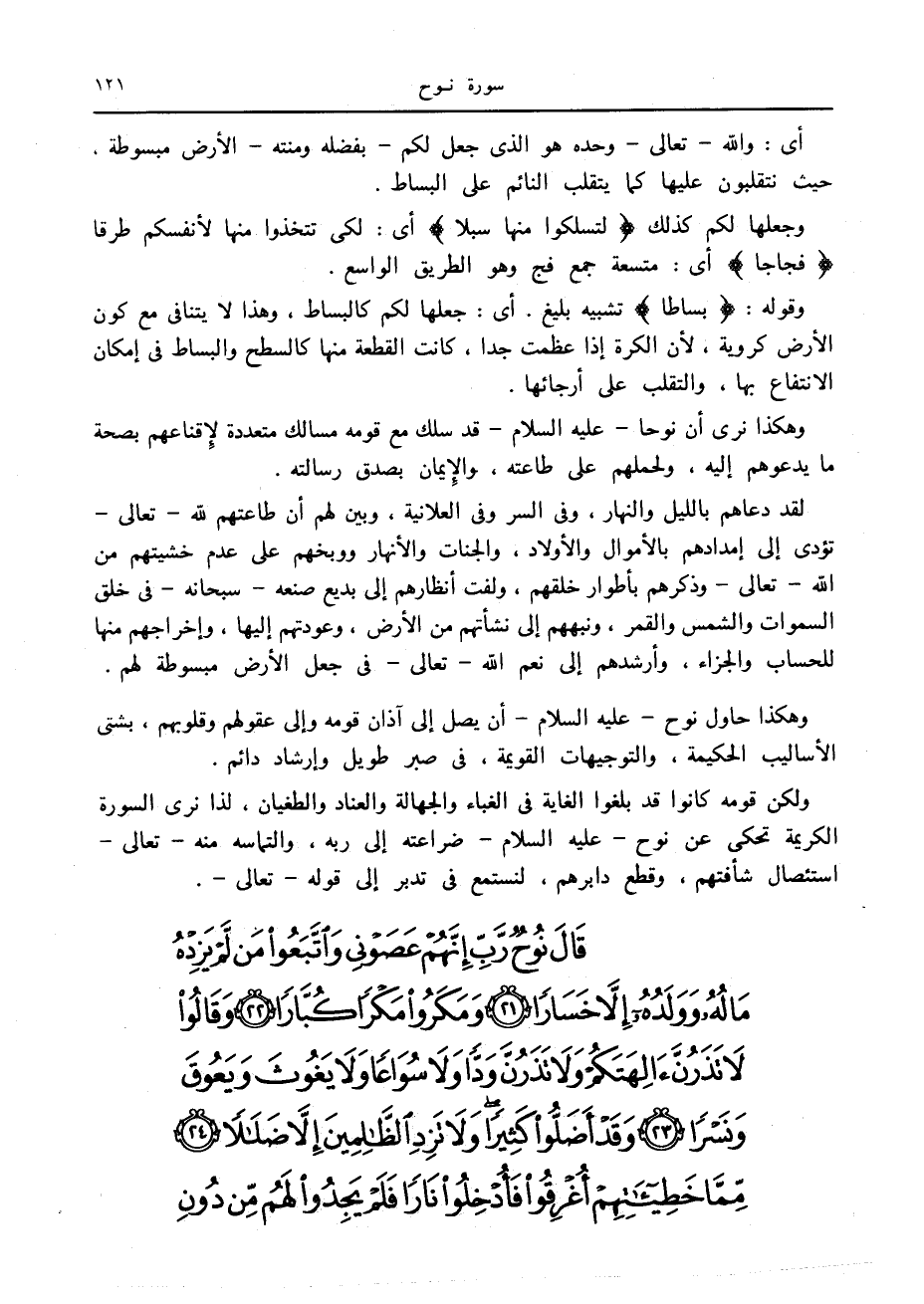 لقد دعاهم بالليل والنهار، وفي السر وفي العلانية، وبين لهم أن طاعتهم لله- تعالى- تؤدى إلى إمدادهم بالأموال والأولاد، والجنات والأنهار ووبخهم على عدم خشيتهم من الله- تعالى- وذكرهم بأطوار خلقهم، ولفت أنظارهم إلى بديع صنعه- سبحانه- في خلق السموات والشمس والقمر، ونبههم إلى نشأتهم من الأرض، وعودتهم إليها، وإخراجهم منها للحساب والجزاء، وأرشدهم إلى نعم الله- تعالى- في جعل الأرض مبسوطة لهم.