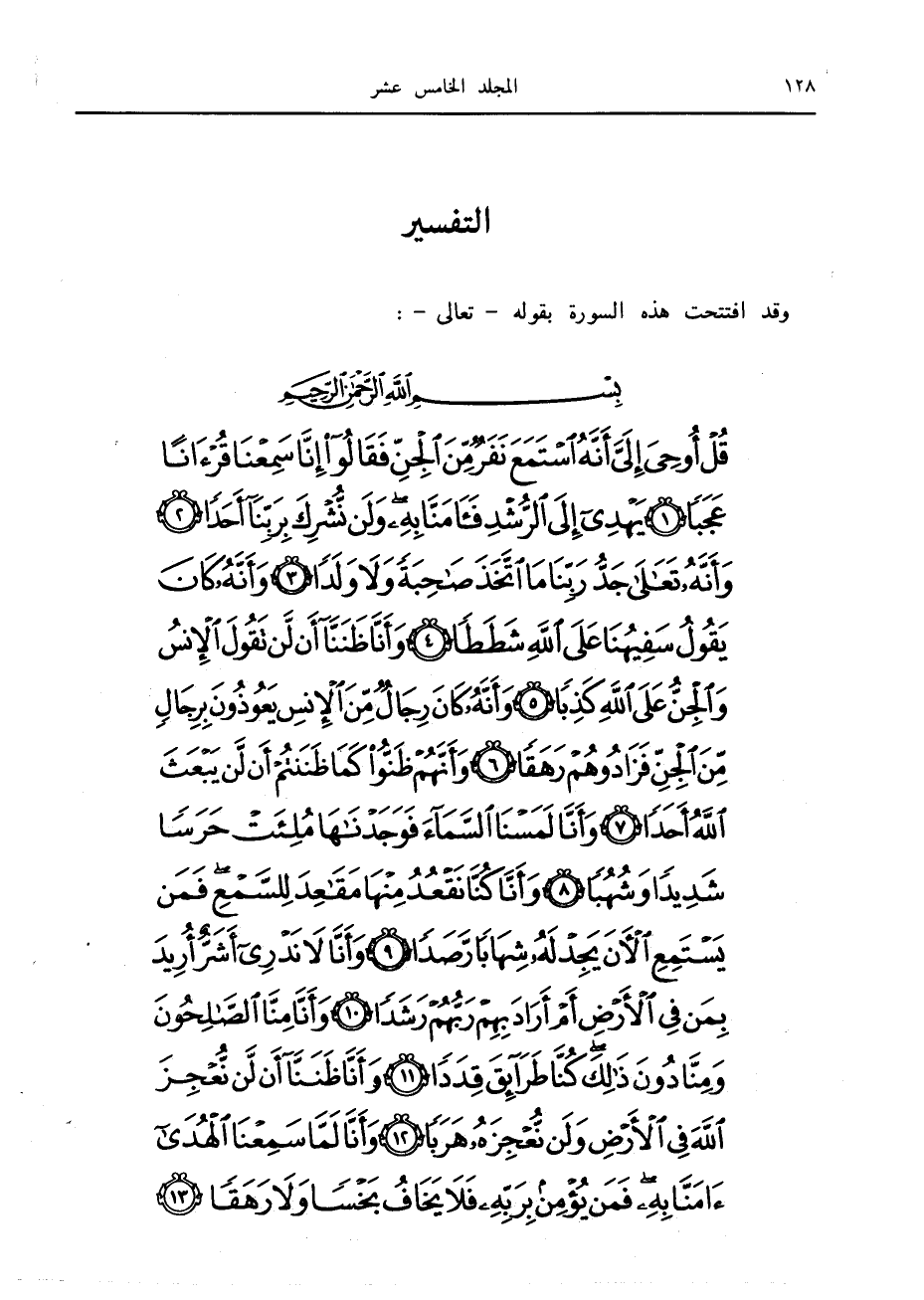 قُلْ أُوحِيَ إِلَيَّ أَنَّهُ اسْتَمَعَ نَفَرٌ مِنَ الْجِنِّ فَقالُوا إِنَّا سَمِعْنا قُرْآناً عَجَباً (1) يَهْدِي إِلَى الرُّشْدِ فَآمَنَّا بِهِ وَلَنْ نُشْرِكَ بِرَبِّنا أَحَداً (2) وَأَنَّهُ تَعالى جَدُّ رَبِّنا مَا اتَّخَذَ صاحِبَةً وَلا وَلَداً (3) وَأَنَّهُ كانَ يَقُولُ سَفِيهُنا عَلَى اللَّهِ شَطَطاً (4)