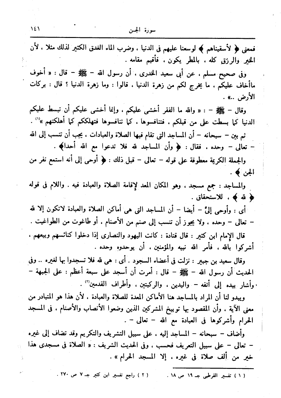 وأضاف- سبحانه- المساجد إليه، على سبيل التشريف والتكريم وقد تضاف إلى غيره- تعالى- على سبيل التعريف فحسب، وفي الحديث الشريف: «الصلاة في مسجدى هذا خير من ألف صلاة في غيره، إلا المسجد الحرام» .