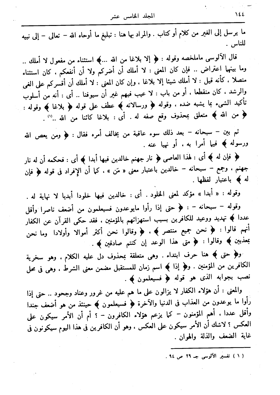 قال الآلوسى ما ملخصه وقوله: إِلَّا بَلاغاً مِنَ اللَّهِ.... استثناء من مفعول لا أملك ...