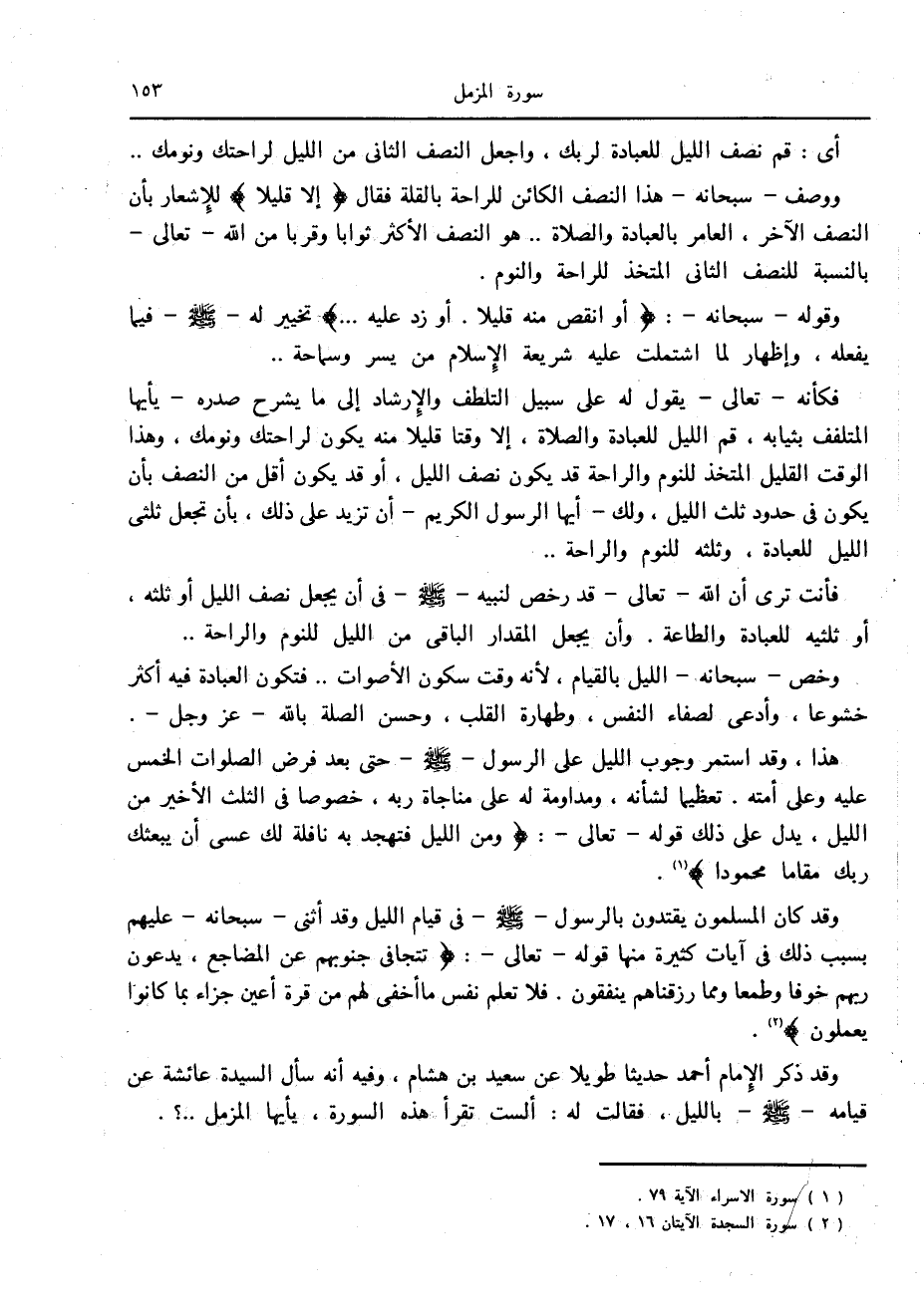 ووصف- سبحانه- هذا النصف الكائن للراحة بالقلة فقال إِلَّا قَلِيلًا للإشعار بأن النصف الآخر، العامر بالعبادة والصلاة ... هو النصف الأكثر ثوابا وقربا من الله- تعالى- بالنسبة للنصف الثاني المتخذ للراحة والنوم.