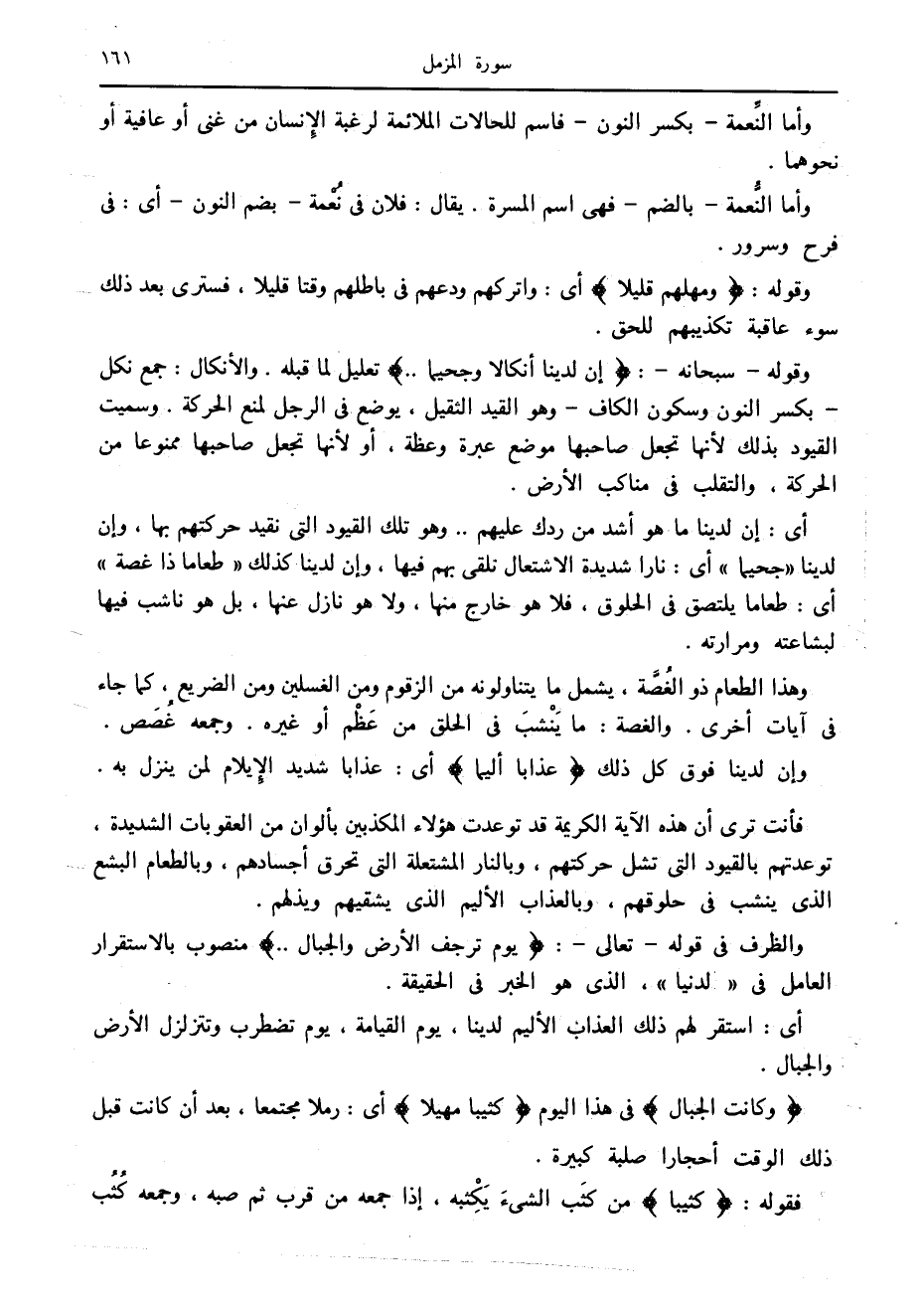 وقوله- سبحانه-: إِنَّ لَدَيْنا أَنْكالًا وَجَحِيماً ... تعليل لما قبله. والأنكال: جمع نكل- بكسر النون وسكون الكاف- وهو القيد الثقيل، يوضع في الرجل لمنع الحركة. وسميت القيود بذلك لأنها تجعل صاحبها موضع عبرة وعظة، أو لأنها تجعل صاحبها ممنوعا من الحركة، والتقلب في مناكب الأرض.
