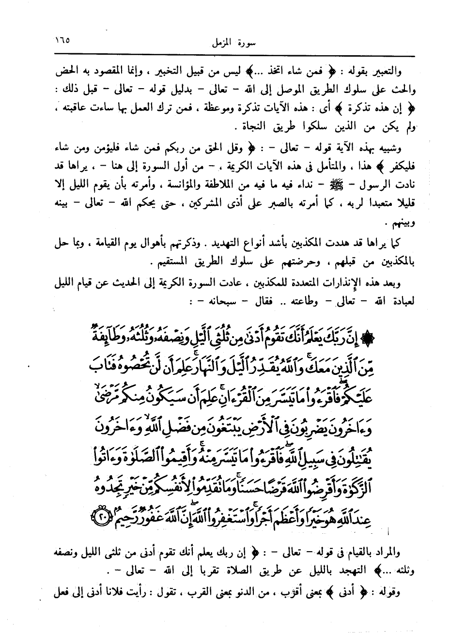 وشبيه بهذه الآية قوله- تعالى-: وَقُلِ الْحَقُّ مِنْ رَبِّكُمْ فَمَنْ شاءَ فَلْيُؤْمِنْ وَمَنْ شاءَ فَلْيَكْفُرْ هذا، والمتأمل في هذه الآيات الكريمة، - من أول السورة إلى هنا-، يراها قد نادت الرسول صلى الله عليه وسلم نداء فيه ما فيه من الملاطفة والمؤانسة، وأمرته بأن يقوم الليل إلا قليلا متعبدا لربه، كما أمرته بالصبر على أذى المشركين، حتى يحكم الله- تعالى- بينه وبينهم.