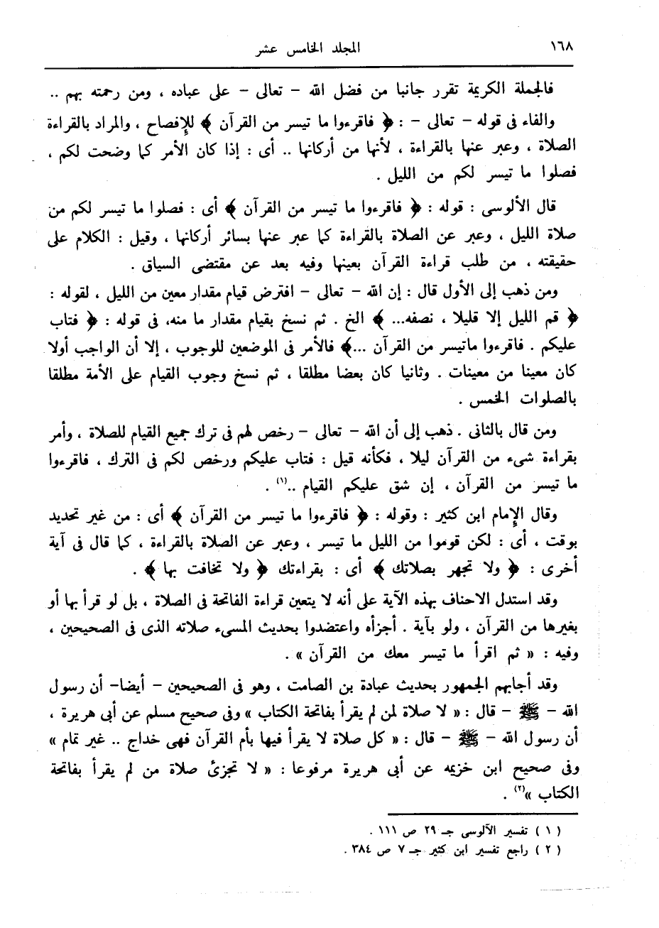 وقال الإمام ابن كثير: وقوله: فَاقْرَؤُا ما تَيَسَّرَ مِنَ الْقُرْآنِ أى: من غير تحديد بوقت، أى: لكن قوموا من الليل ما تيسر، وعبر عن الصلاة بالقراءة، كما قال في آية أخرى: وَلا تَجْهَرْ بِصَلاتِكَ أى: بقراءتك وَلا تُخافِتْ بِها.