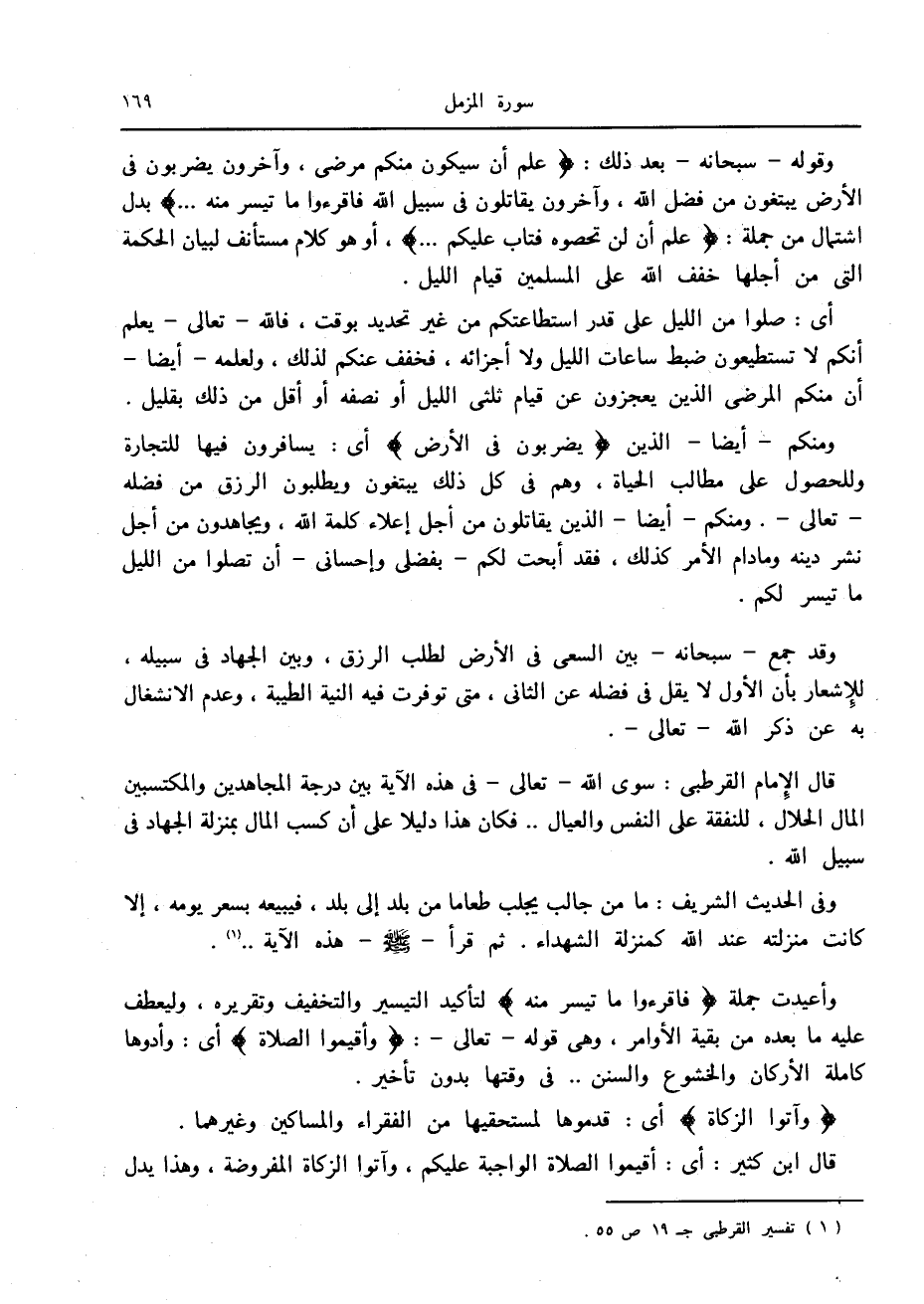 وقوله- سبحانه- بعد ذلك: عَلِمَ أَنْ سَيَكُونُ مِنْكُمْ مَرْضى، وَآخَرُونَ يَضْرِبُونَ فِي الْأَرْضِ يَبْتَغُونَ مِنْ فَضْلِ اللَّهِ، وَآخَرُونَ يُقاتِلُونَ فِي سَبِيلِ اللَّهِ فَاقْرَؤُا ما تَيَسَّرَ مِنْهُ ... بدل اشتمال من جملة: عَلِمَ أَنْ لَنْ تُحْصُوهُ فَتابَ عَلَيْكُمْ ... ، أو هو كلام مستأنف لبيان الحكمة التي من أجلها خفف الله على المسلمين قيام الليل.