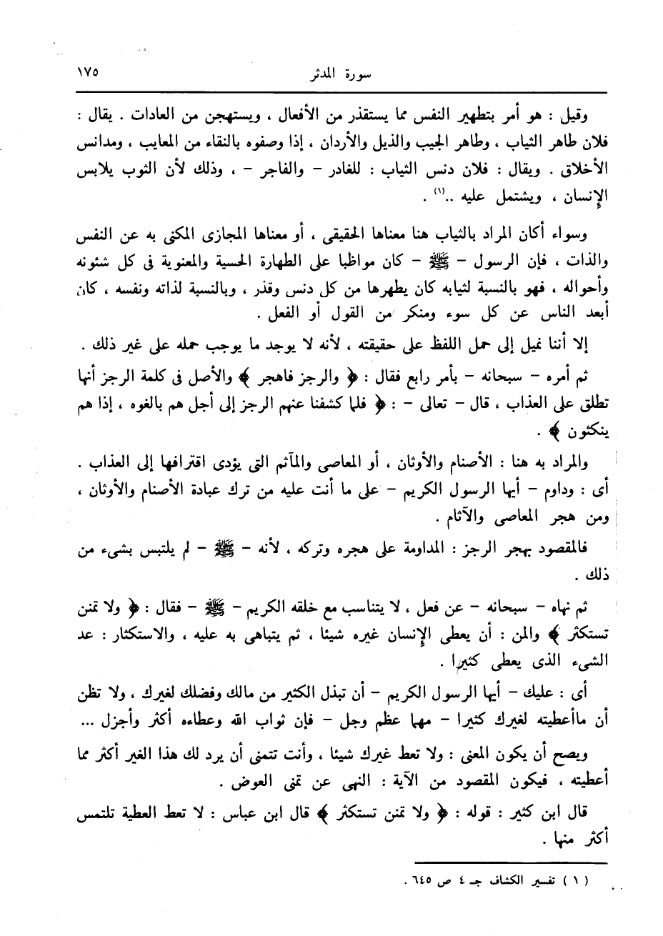وسواء أكان المراد بالثياب هنا معناها الحقيقي، أو معناها المجازى المكنى به عن النفس والذات، فإن الرسول صلى الله عليه وسلم كان مواظبا على الطهارة الحسية والمعنوية في كل شئونه وأحواله، فهو بالنسبة لثيابه كان يطهرها من كل دنس وقذر، وبالنسبة لذاته ونفسه، كان أبعد الناس عن كل سوء ومنكر من القول أو الفعل.