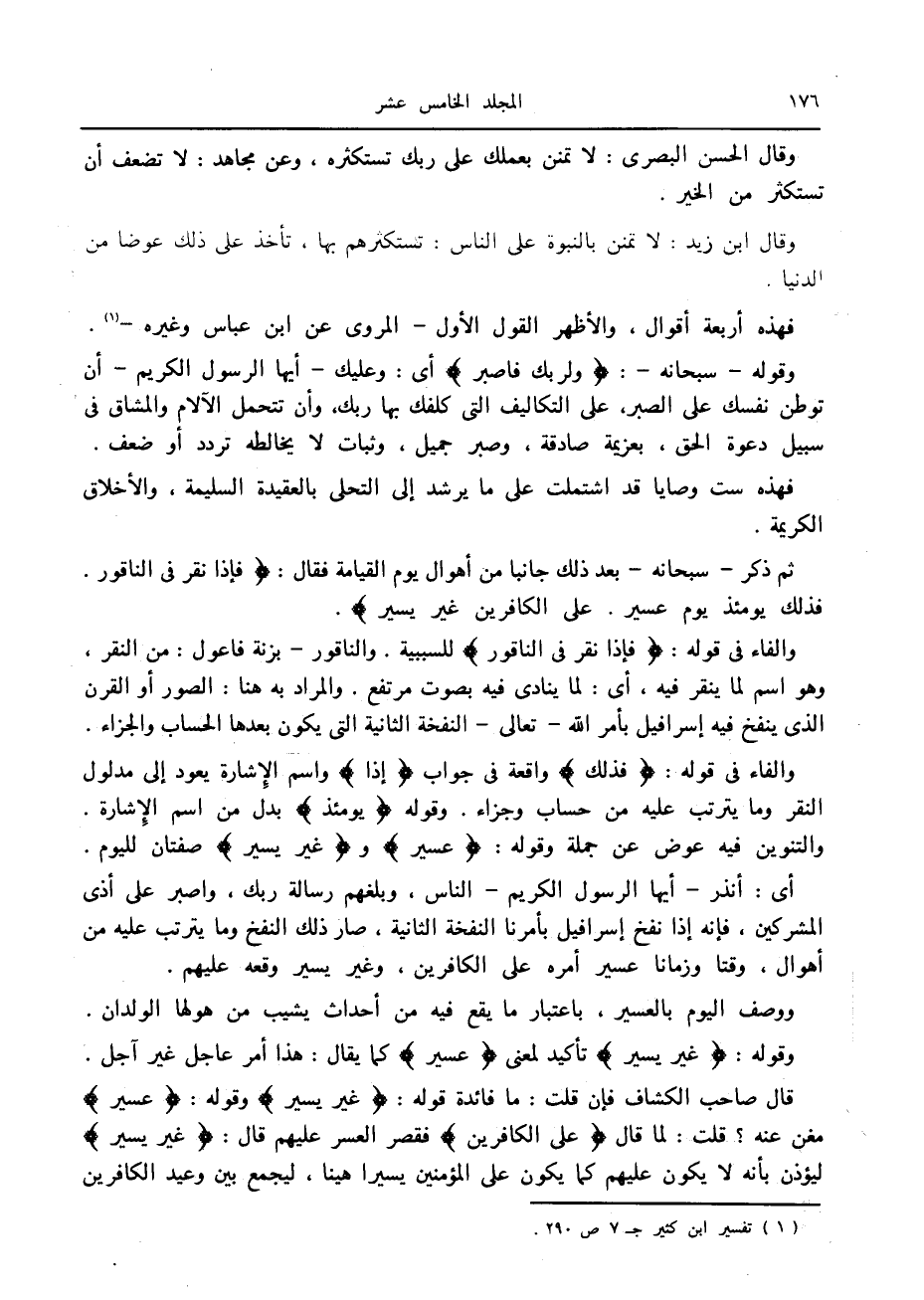 ثم ذكر- سبحانه- بعد ذلك جانبا من أهوال يوم القيامة فقال: فَإِذا نُقِرَ فِي النَّاقُورِ. فَذلِكَ يَوْمَئِذٍ يَوْمٌ عَسِيرٌ. عَلَى الْكافِرِينَ غَيْرُ يَسِيرٍ.
