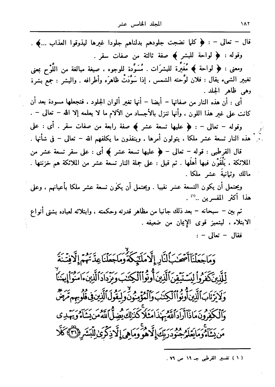 قال القرطبي: قوله- تعالى- عَلَيْها تِسْعَةَ عَشَرَ أى: على سقر تسعة عشر من الملائكة، يلقون فيها أهلها. ثم قيل: على جملة النار تسعة عشر من الملائكة هم خزنتها.