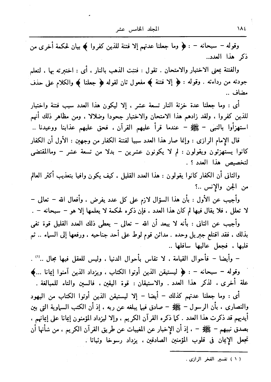 قال الإمام الرازي: وإنما صار هذا العدد سببا لفتنة الكفار من وجهين: الأول أن الكفار كانوا يستهزئون ويقولون: لم لا يكونون عشرين- بدلا من تسعة عشر- وما المقتضى لتخصيص هذا العدد؟.