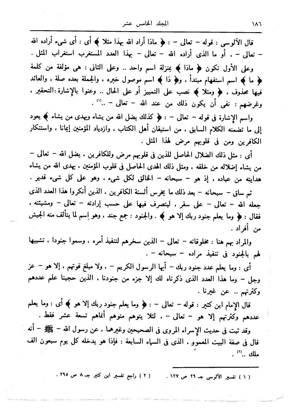 قال الإمام ابن كثير: قوله- تعالى-: وَما يَعْلَمُ جُنُودَ رَبِّكَ إِلَّا هُوَ أى: وما يعلم عددهم وكثرتهم إلا هو- تعالى-، لئلا يتوهم متوهم أنماهم تسعة عشر فقط.