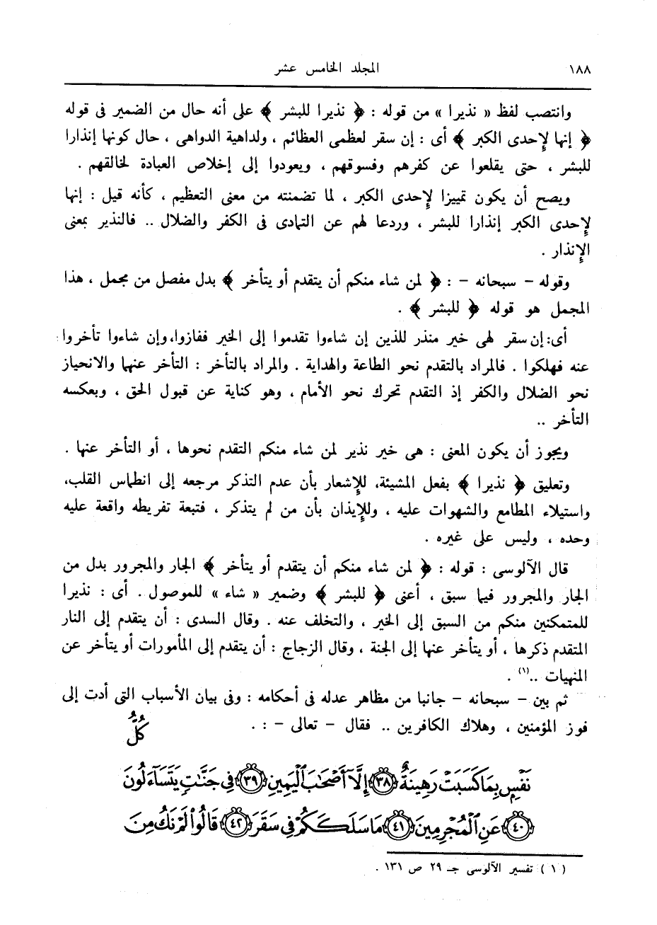 قال الآلوسى: قوله: لِمَنْ شاءَ مِنْكُمْ أَنْ يَتَقَدَّمَ أَوْ يَتَأَخَّرَ الجار والمجرور بدل من الجار والمجرور فيما سبق، أعنى لِلْبَشَرِ وضمير «شاء» للموصول. أى: نذيرا للمتمكنين منكم من السبق إلى الخير، والتخلف عنه. وقال السدى: أن يتقدم إلى النار المتقدم ذكرها، أو يتأخر عنها إلى الجنة، وقال الزجاج: أن يتقدم إلى المأمورات أو يتأخر عن المنهيات.. «1» .