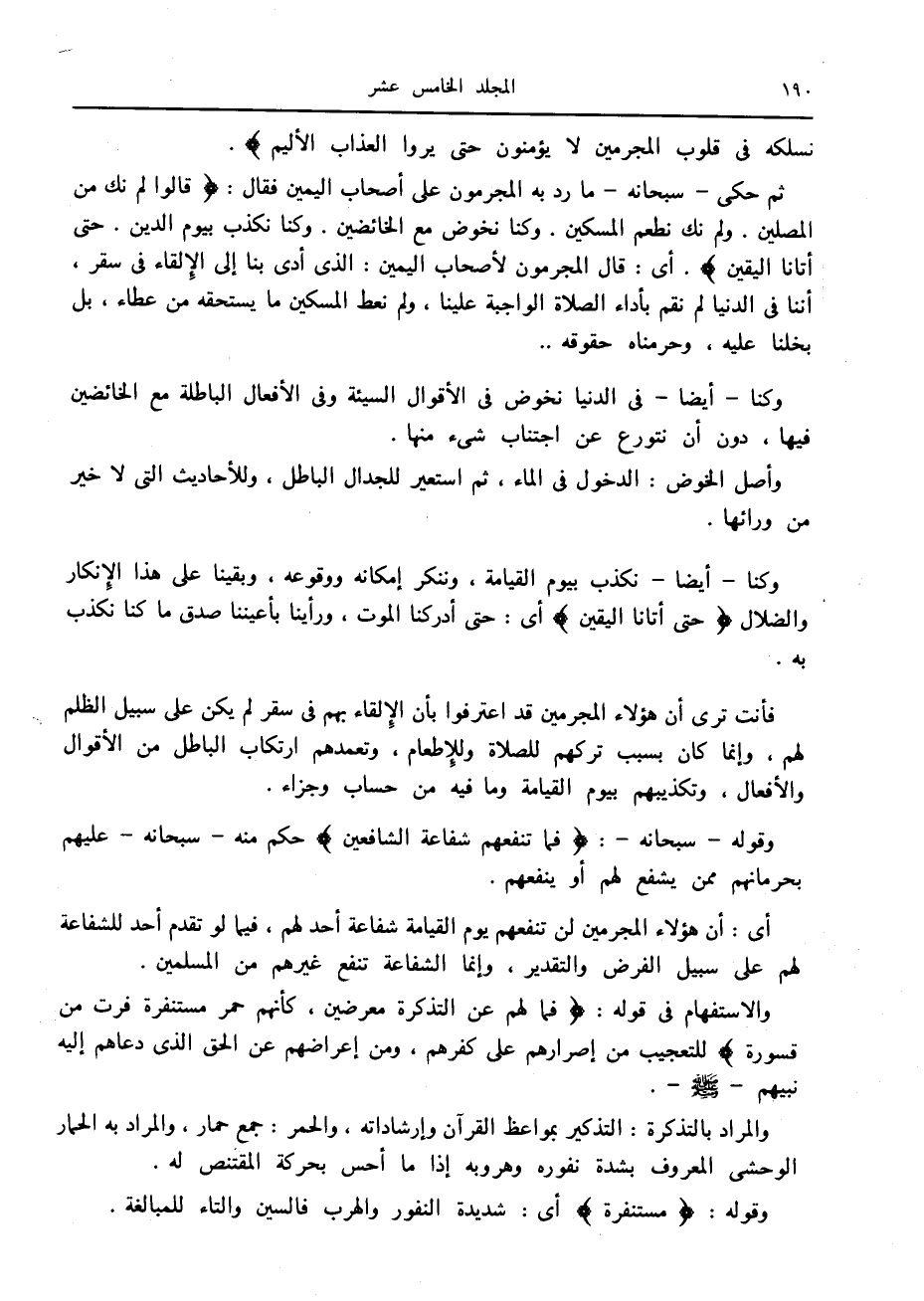 كَذلِكَ نَسْلُكُهُ فِي قُلُوبِ الْمُجْرِمِينَ لا يُؤْمِنُونَ بِهِ وَقَدْ خَلَتْ سُنَّةُ الْأَوَّلِينَ ثم حكى- سبحانه- ما رد به المجرمون على أصحاب اليمين فقال: قالُوا لَمْ نَكُ مِنَ الْمُصَلِّينَ. وَلَمْ نَكُ نُطْعِمُ الْمِسْكِينَ. وَكُنَّا نَخُوضُ مَعَ الْخائِضِينَ. وَكُنَّا نُكَذِّبُ بِيَوْمِ الدِّينِ. حَتَّى أَتانَا الْيَقِينُ. أى: قال المجرمون لأصحاب اليمين: الذي أدى بنا إلى الإلقاء في سقر، أننا في الدنيا لم نقم بأداء الصلاة الواجبة علينا، ولم نعط المسكين ما يستحقه من عطاء، بل بخلنا عليه، وحرمناه حقوقه..
