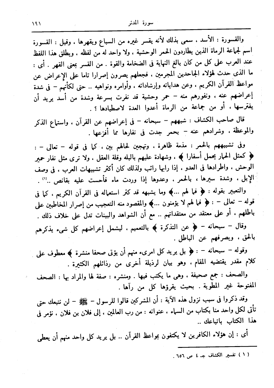قال صاحب الكشاف: شبههم- سبحانه- في إعراضهم عن القرآن، واستماع الذكر والموعظة، وشرادهم عنه- بحمر جدت في نفارها مما أفزعها.