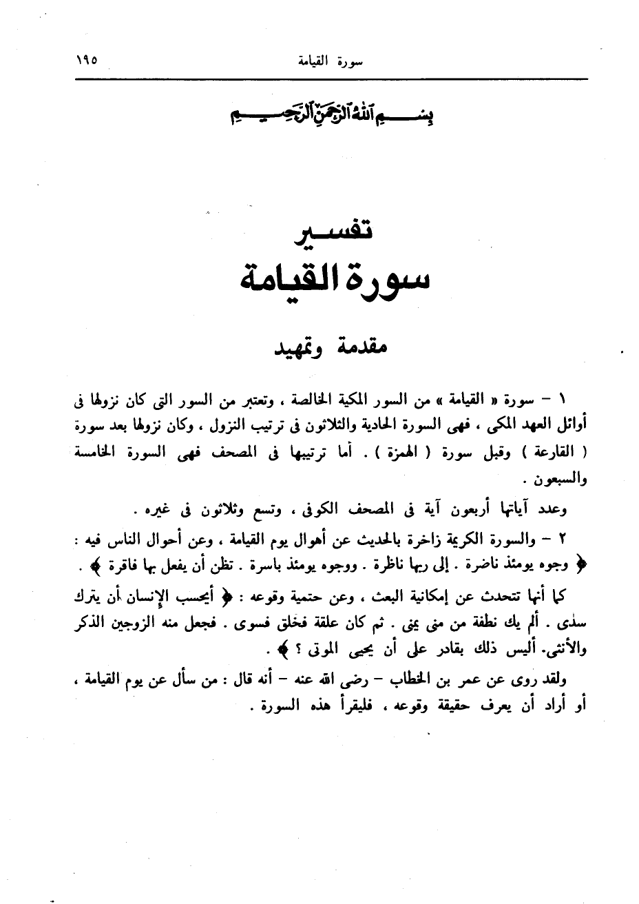 1- سورة «القيامة» من السور المكية الخالصة، وتعتبر من السور التي كان نزولها في أوائل العهد المكي، فهي السورة الحادية والثلاثون في ترتيب النزول، وكان نزولها بعد سورة (القارعة) وقبل سورة (الهمزة) . أما ترتيبها في المصحف فهي السورة الخامسة والسبعون.
