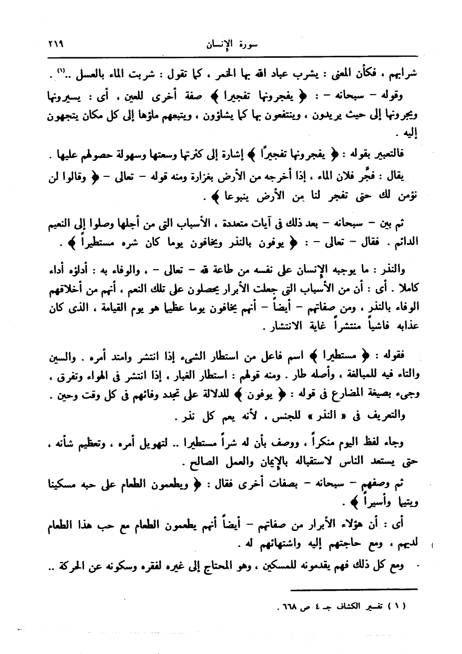 ثم بين- سبحانه- بعد ذلك في آيات متعددة، الأسباب التي من أجلها وصلوا إلى النعيم الدائم. فقال- تعالى-: يُوفُونَ بِالنَّذْرِ وَيَخافُونَ يَوْماً كانَ شَرُّهُ مُسْتَطِيراً.