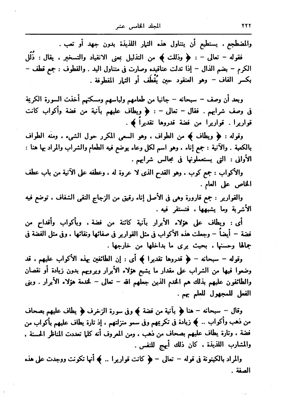 وقوله: وَيُطافُ من الطواف، وهو السعى المكرر حول الشيء، ومنه الطواف بالكعبة. والآنية: جمع إناء، وهو اسم لكل وعاء يوضع فيه الطعام والشراب والمراد بها هنا: