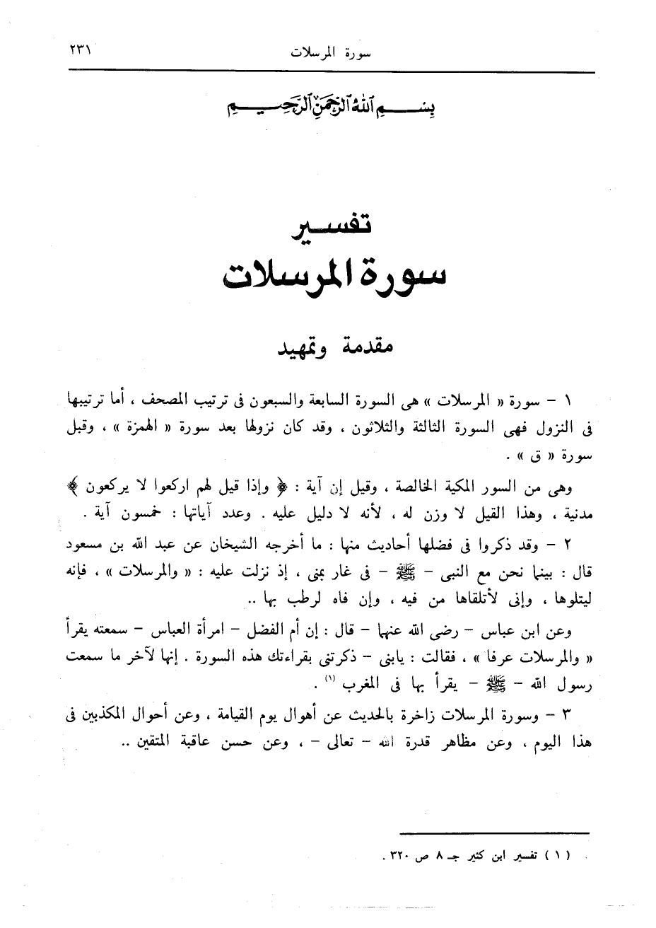 1- سورة «المرسلات» هي السورة السابعة والسبعون في ترتيب المصحف، أما ترتيبها في النزول فهي السورة الثالثة والثلاثون، وقد كان نزولها بعد سورة «الهمزة» ، وقبل سورة «ق» .