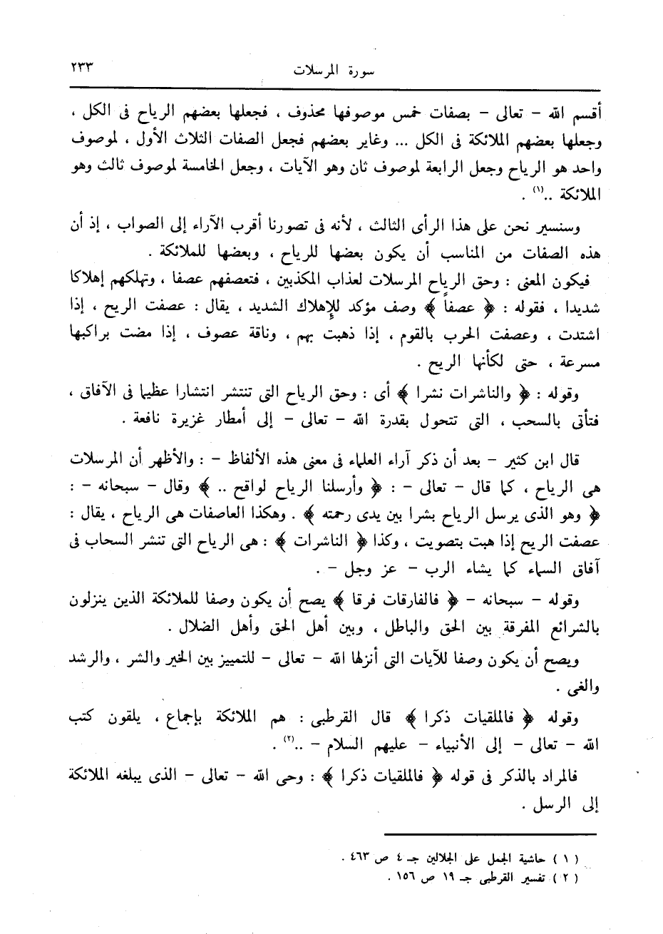 وسنسير نحن على هذا الرأى الثالث، لأنه في تصورنا أقرب الآراء إلى الصواب، إذ أن هذه الصفات من المناسب أن يكون بعضها للرياح، وبعضها للملائكة.