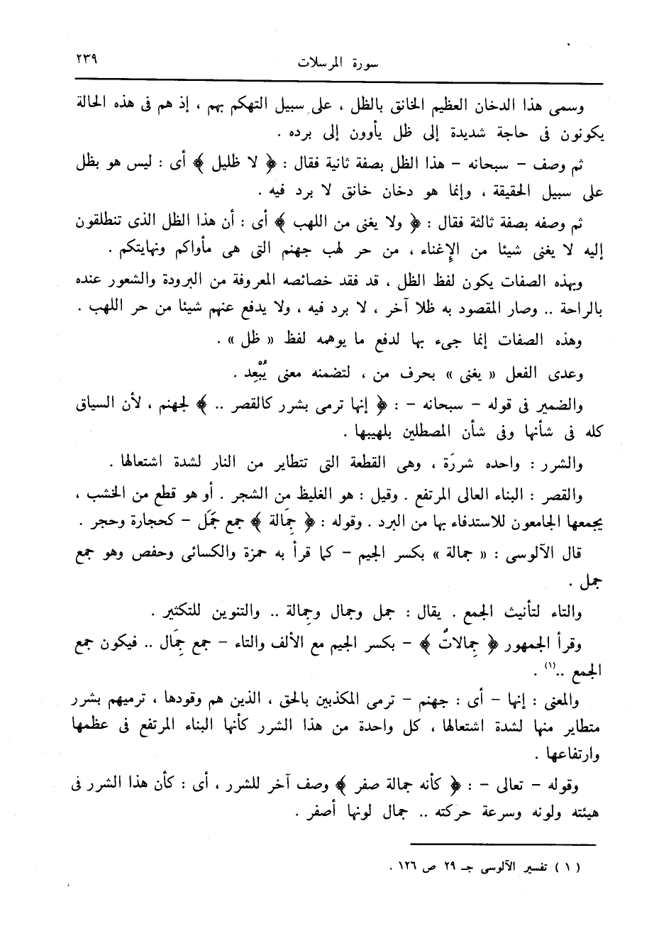 وقوله- تعالى-: كَأَنَّهُ جِمالَتٌ صُفْرٌ وصف آخر للشرر، أى: كأن هذا الشرر في هيئته ولونه وسرعة حركته.. جمال لونها أصفر.