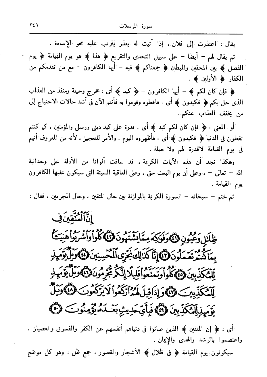 إِنَّ الْمُتَّقِينَ فِي ظِلالٍ وَعُيُونٍ (41) وَفَواكِهَ مِمَّا يَشْتَهُونَ (42) كُلُوا وَاشْرَبُوا هَنِيئاً بِما كُنْتُمْ تَعْمَلُونَ (43) إِنَّا كَذلِكَ نَجْزِي الْمُحْسِنِينَ (44) وَيْلٌ يَوْمَئِذٍ لِلْمُكَذِّبِينَ (45)
