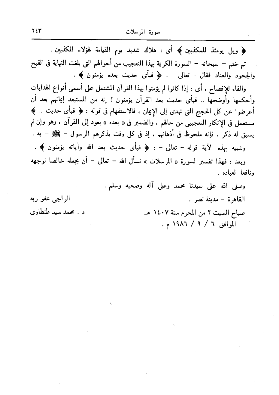 وبعد: فهذا تفسير لسورة «المرسلات» نسأل الله- تعالى- أن يجعله خالصا لوجهه ونافعا لعباده.