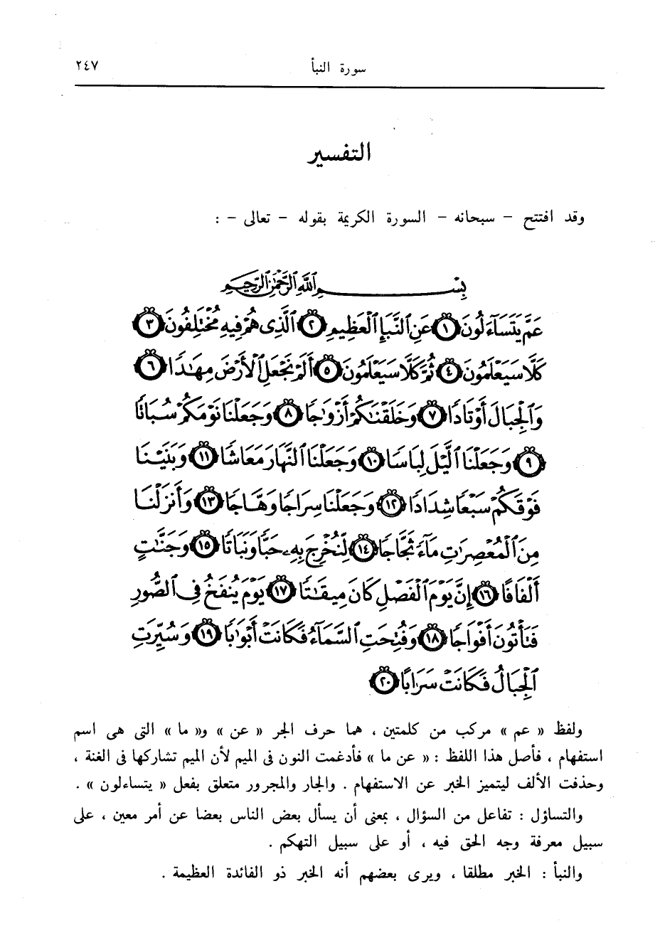ولفظ «عم» مركب من كلمتين، هما حرف الجر «عن» و «ما» التي هي اسم استفهام، فأصل هذا اللفظ: «عن ما» فأدغمت النون في الميم لأن الميم تشاركها في الغنة، وحذفت الألف ليتميز الخبر عن الاستفهام. والجار والمجرور متعلق بفعل «يتساءلون» .