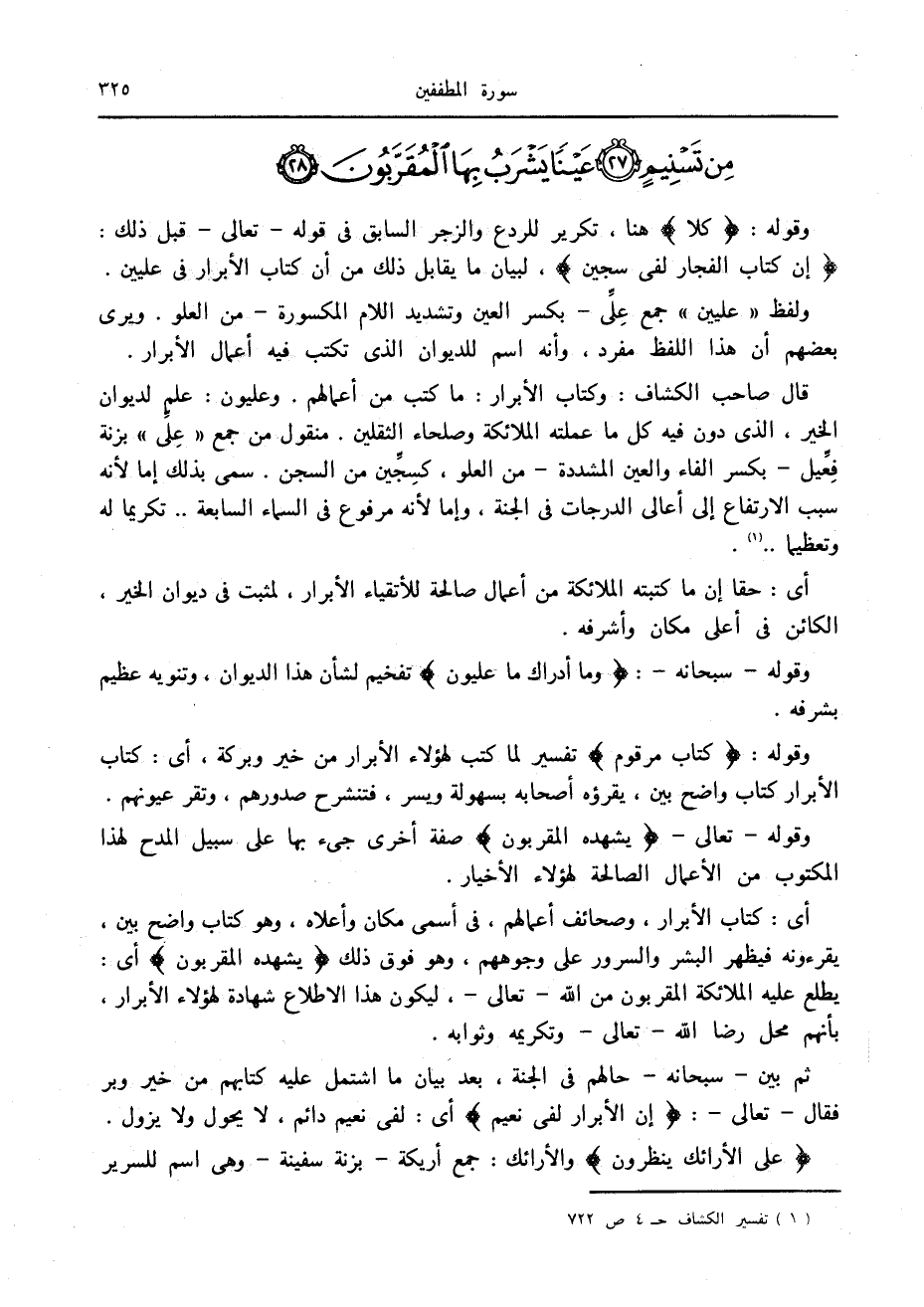 قال صاحب الكشاف: وكتاب الأبرار: ما كتب من أعمالهم. وعليون: علم لديوان الخير، الذي دون فيه كل ما عملته الملائكة وصلحاء الثقلين. منقول من جمع «عليّ» بزنة فعّيل- بكسر الفاء والعين المشددة- من العلو، كسجّين من السجن. سمى بذلك إما لأنه سبب الارتفاع إلى أعالى الدرجات في الجنة، وإما لأنه مرفوع في السماء السابعة.. تكريما له وتعظيما.. «1» .