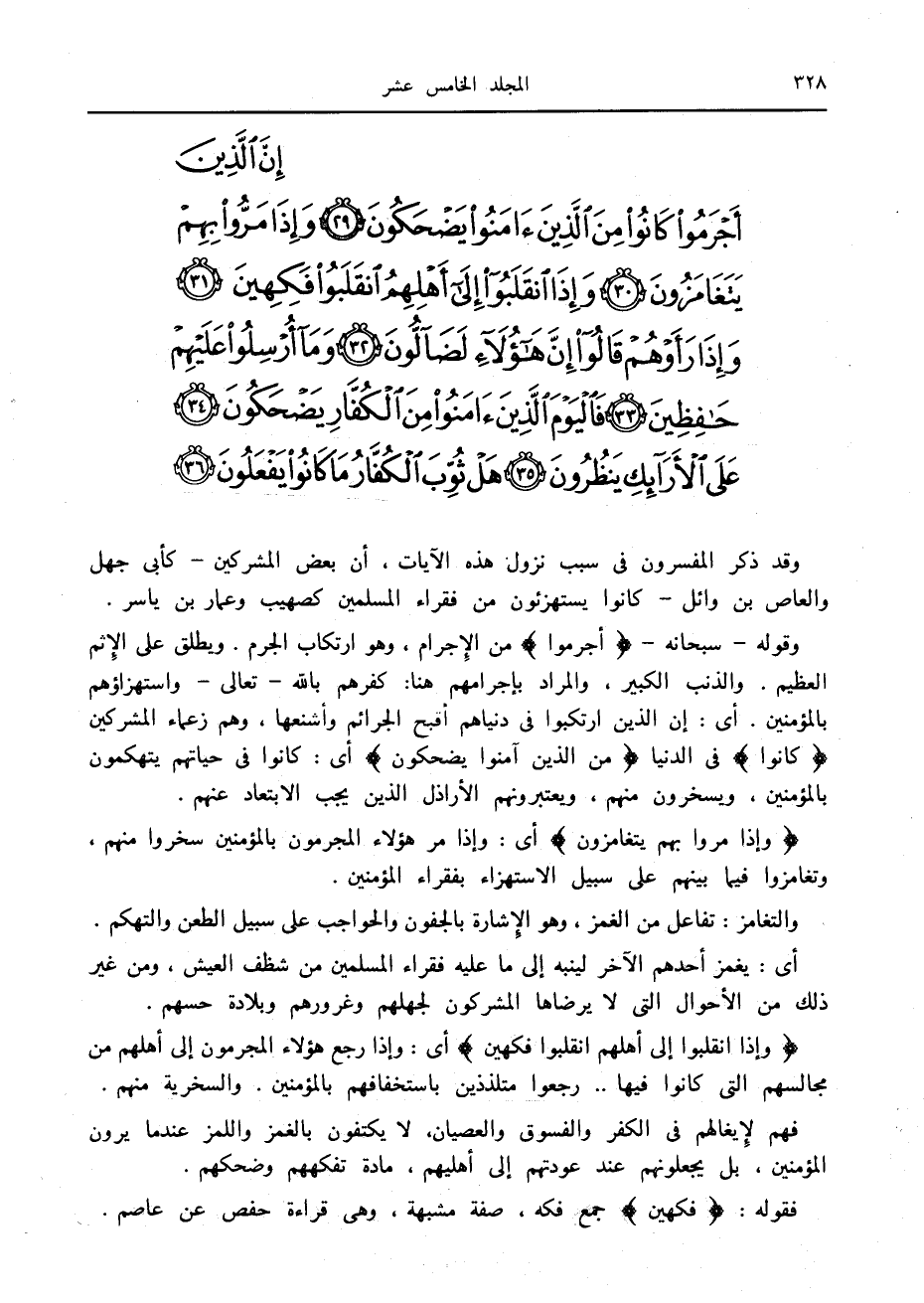 إِنَّ الَّذِينَ أَجْرَمُوا كانُوا مِنَ الَّذِينَ آمَنُوا يَضْحَكُونَ (29) وَإِذا مَرُّوا بِهِمْ يَتَغامَزُونَ (30) وَإِذَا انْقَلَبُوا إِلى أَهْلِهِمُ انْقَلَبُوا فَكِهِينَ (31) وَإِذا رَأَوْهُمْ قالُوا إِنَّ هؤُلاءِ لَضالُّونَ (32) وَما أُرْسِلُوا عَلَيْهِمْ حافِظِينَ (33)