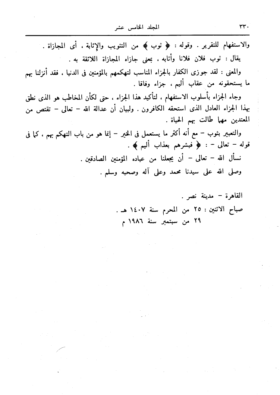 وجاء الجزاء بأسلوب الاستفهام، لتأكيد هذا الجزاء، حتى لكأن المخاطب هو الذي نطق بهذا الجزاء العادل الذي استحقه الكافرون. ولبيان أن عدالة الله- تعالى- تقتص من المعتدين مهما طالت بهم الحياة.