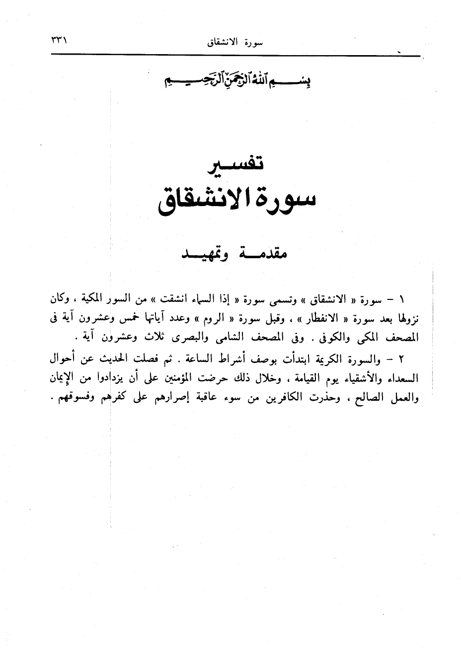 1- سورة «الانشقاق» وتسمى سورة «إذا السماء انشقت» من السور المكية، وكان نزولها بعد سورة «الانفطار» ، وقبل سورة «الروم» وعدد آياتها خمس وعشرون آية في المصحف المكي والكوفي. وفي المصحف الشامي والبصري ثلاث وعشرون آية.