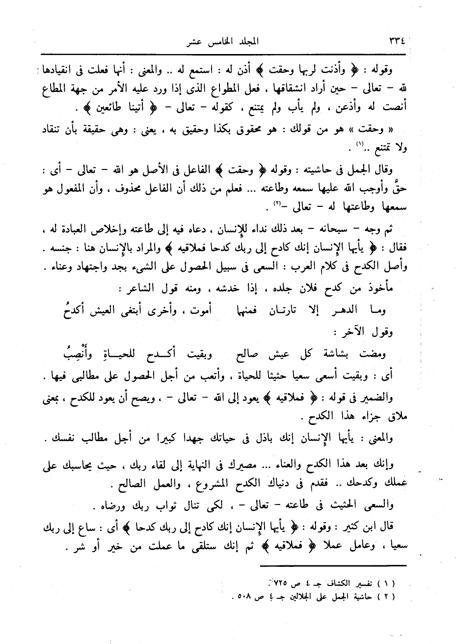 قال ابن كثير: وقوله: يا أَيُّهَا الْإِنْسانُ إِنَّكَ كادِحٌ إِلى رَبِّكَ كَدْحاً أى: ساع إلى ربك سعيا، وعامل عملا فَمُلاقِيهِ ثم إنك ستلقى ما عملت من خير أو شر.
