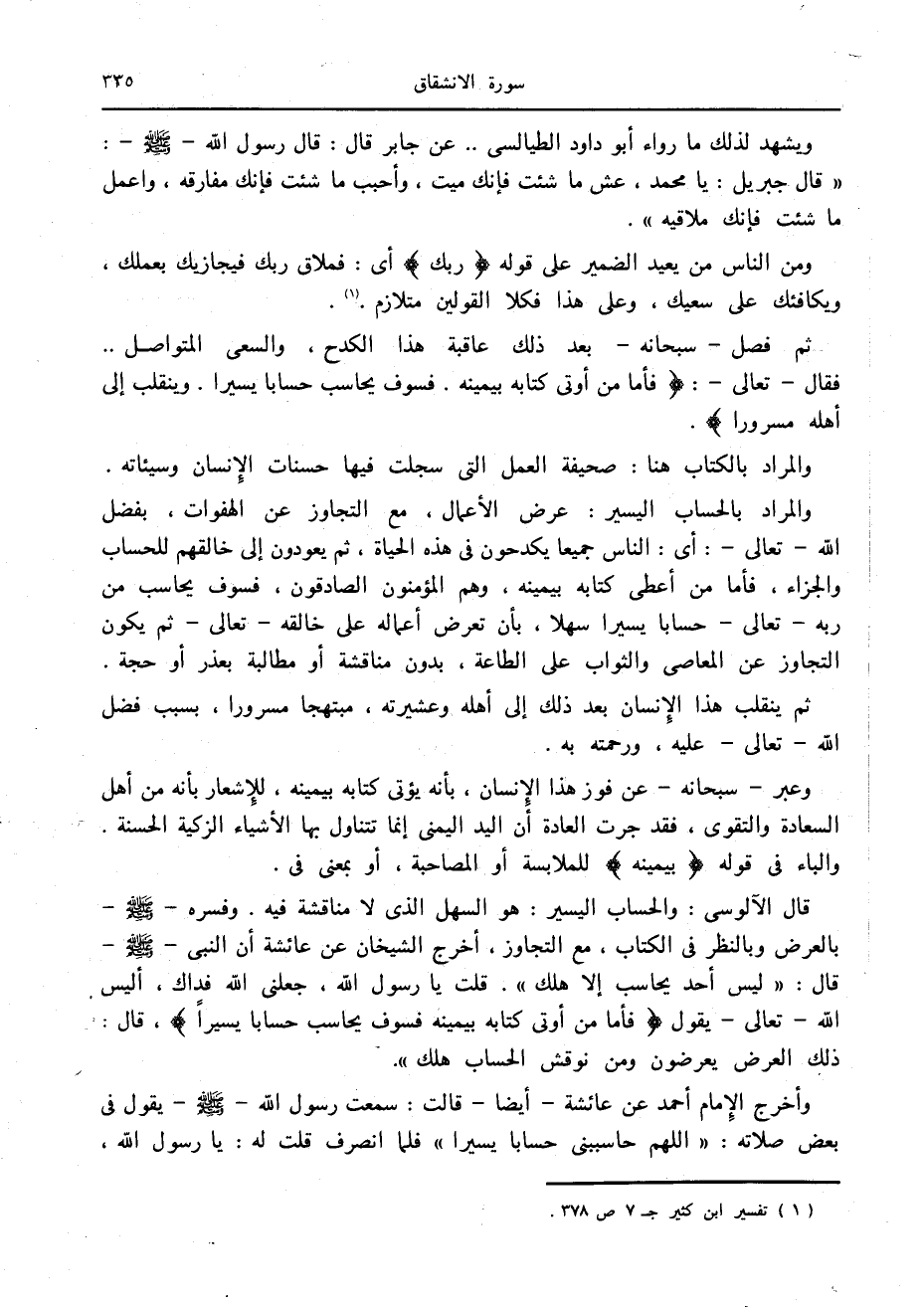 والمراد بالحساب اليسير: عرض الأعمال، مع التجاوز عن الهفوات، بفضل الله- تعالى-: أى: الناس جميعا يكدحون في هذه الحياة، ثم يعودون إلى خالقهم للحساب والجزاء، فأما من أعطى كتابه بيمينه، وهم المؤمنون الصادقون، فسوف يحاسب من ربه- تعالى- حسابا يسيرا سهلا، بأن تعرض أعماله على خالقه- تعالى- ثم يكون التجاوز عن المعاصي والثواب على الطاعة، بدون مناقشة أو مطالبة بعذر أو حجة.