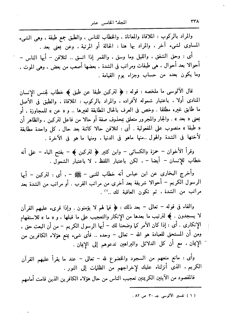 قال الآلوسى ما ملخصه: قوله: لَتَرْكَبُنَّ طَبَقاً عَنْ طَبَقٍ خطاب لجنس الإنسان المنادى أولا، باعتبار شموله لأفراده، والمراد بالركوب: الملاقاة، والطبق في الأصل ما طابق غيره مطلقا. وخص في العرف بالحال المطابقة لغيرها.. و «عن» للمجاوزة، أو بمعنى «بعد» . والجار والمجرور متعلق بمحذوف صفة أو حالا من فاعل لتركبن، والظاهر أن «طبقا» منصوب على المفعولية. أى: لتلاقن حالا كائنة بعد حال، كل واحدة مطابقة لأختها في الشدة والهول.. منها ما هو في الدنيا، ومنها ما هو في الآخرة.