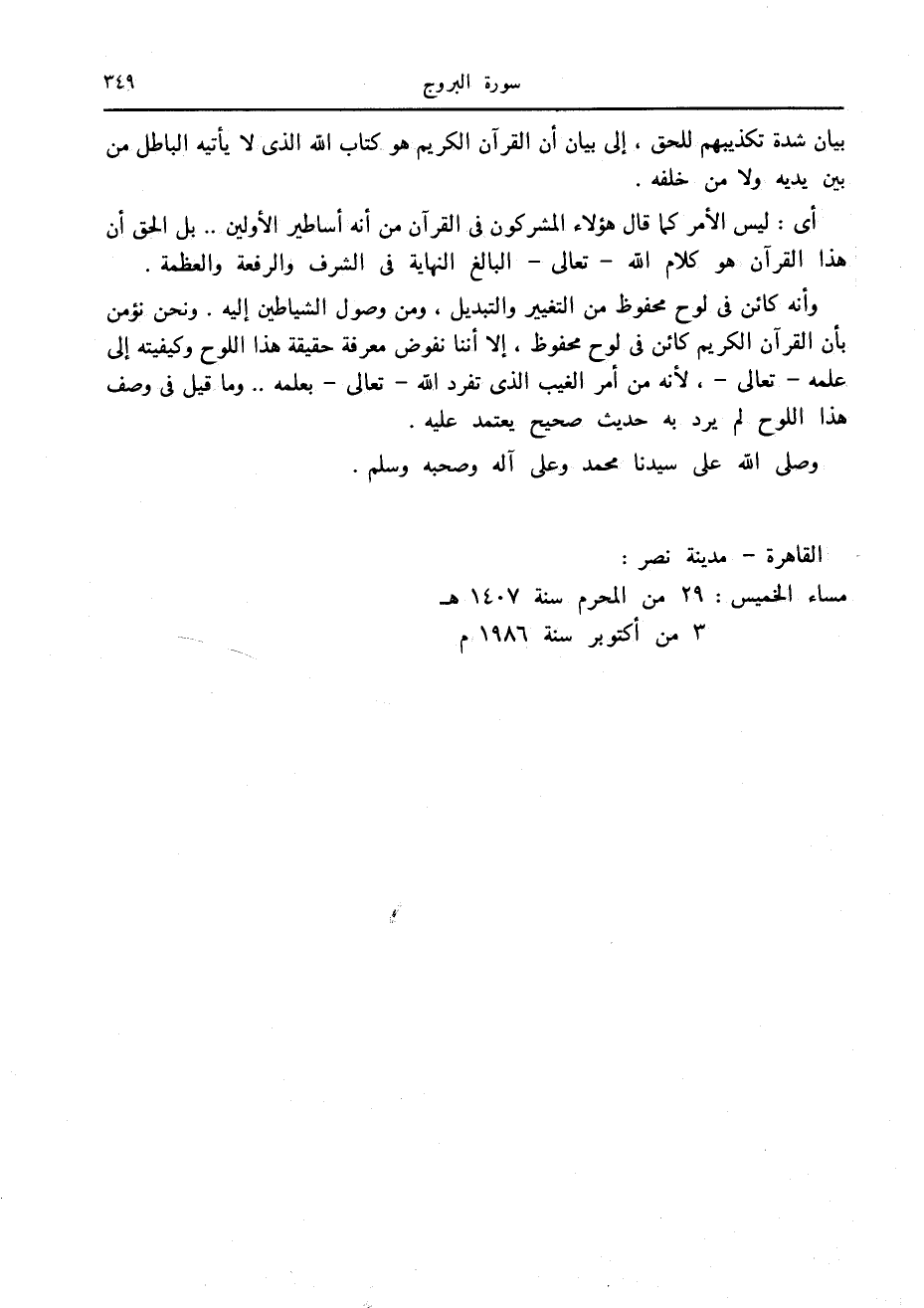 وأنه كائن في لوح محفوظ من التغيير والتبديل، ومن وصول الشياطين إليه. ونحن نؤمن بأن القرآن الكريم كائن في لوح محفوظ، إلا أننا نفوض معرفة حقيقة هذا اللوح وكيفيته إلى علمه- تعالى-، لأنه من أمر الغيب الذي تفرد الله- تعالى- بعلمه.. وما قيل في وصف هذا اللوح لم يرد به حديث صحيح يعتمد عليه.