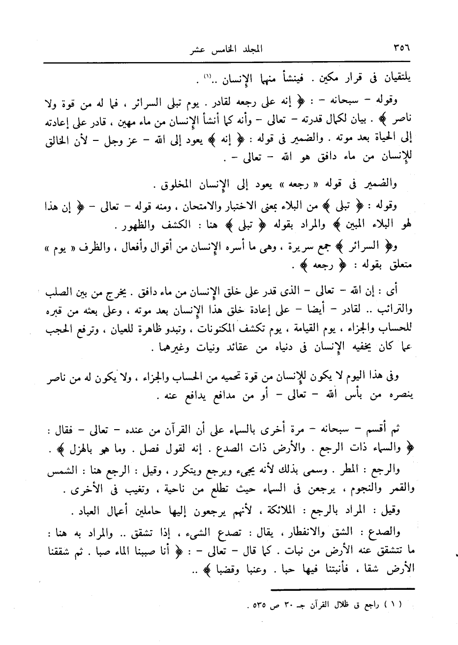 وقوله- سبحانه-: إِنَّهُ عَلى رَجْعِهِ لَقادِرٌ. يَوْمَ تُبْلَى السَّرائِرُ، فَما لَهُ مِنْ قُوَّةٍ وَلا ناصِرٍ. بيان لكمال قدرته- تعالى- وأنه كما أنشأ الإنسان من ماء مهين، قادر على إعادته إلى الحياة بعد موته. والضمير في قوله: إِنَّهُ يعود إلى الله- عز وجل- لأن الخالق للإنسان من ماء دافق هو الله- تعالى-.