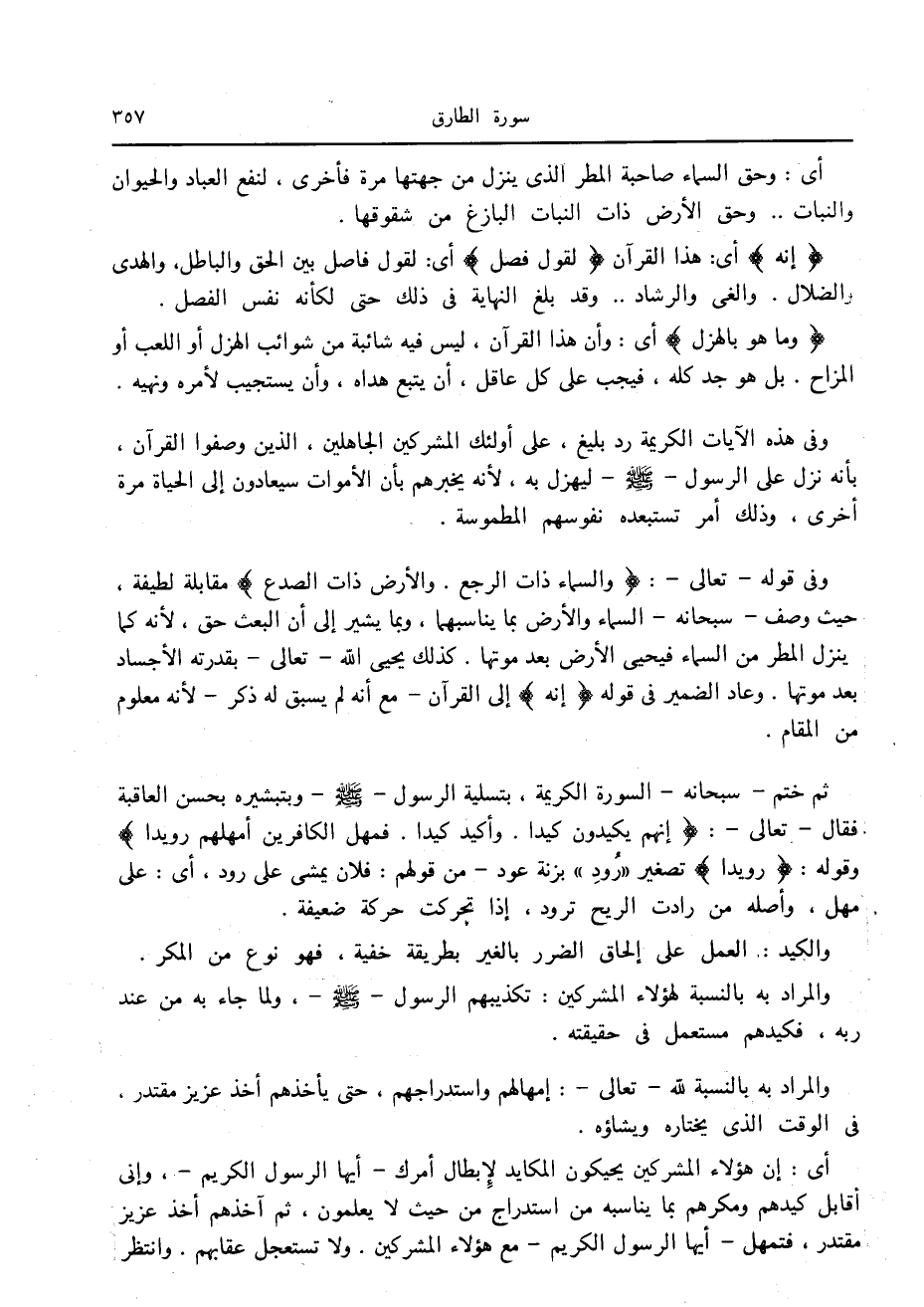 وفي قوله- تعالى-: وَالسَّماءِ ذاتِ الرَّجْعِ. وَالْأَرْضِ ذاتِ الصَّدْعِ مقابلة لطيفة، حيث وصف- سبحانه- السماء والأرض بما يناسبهما، وبما يشير إلى أن البعث حق، لأنه كما ينزل المطر من السماء فيحيى الأرض بعد موتها. كذلك يحيى الله- تعالى- بقدرته الأجساد بعد موتها. وعاد الضمير في قوله إِنَّهُ إلى القرآن- مع أنه لم يسبق له ذكر- لأنه معلوم من المقام.